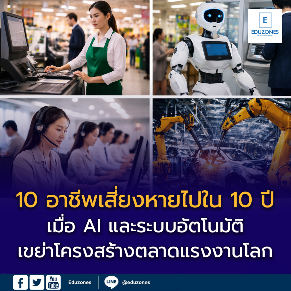 EZ Webmaster February 27, 2026 EZ Webmaster February 27, 2026 10 อาชีพเสี่ยงถูกแทนที่ใน 10 ปีข้างหน้า เมื่อ AI และระบบอัตโนมัติเขย่าโครงสร้างตลาดแรงงานโลก 10 อาชีพเสี่ยงถูกแทนที่ใน 10 ปีข้างหน้า เมื่อ AI และระบบอัตโนมัติเขย่าโครงสร้างตลาดแรงงานโลก ท่ามกลางการก้าวกระโดดของเทคโนโลยีปัญญาประดิษฐ์ (AI) ระบบอัตโนมัติ และแพลตฟอร์มดิจิทัล โลกการทำงานกำลังเผชิญการเปลี่ยนแปลงครั้งใหญ่ รายงานระดับโลกจาก World Economic Forum (WEF) ปี 2025 รวมถึงบทวิเคราะห์จากบริษัทเทคโนโลยีอย่าง Microsoft และ OpenAI ชี้ตรงกันว่า ภายในปี 2035 จะเกิด “การขยับตัวครั้งใหญ่ของโครงสร้างอาชีพ” โดยมีงานจำนวนมากที่มีความเสี่ยงสูงจะถูกแทนที่ด้วยเทคโนโลยี แนวโน้มนี้ไม่ได้หมายถึง “งานจะหายไปทั้งหมด” แต่หมายถึง “รูปแบบงานแบบเดิม” กำลังถูกปรับเปลี่ยนอย่างรวดเร็ว โดยเฉพาะงานที่มีลักษณะทำซ้ำ เป็นกิจวัตร หรือสามารถใช้ระบบอัตโนมัติทดแทนได้ 10 อาชีพที่มีแนวโน้มลดลงในอีกไม่เกิน 10 ปี 1. พนักงานแคชเชียร์ ร้านค้าปลีกจำนวนมากใช้ระบบ Self-checkout และชำระเงินอัตโนมัติ ลูกค้าสามารถสแกนและจ่ายเงินเองได้ ทำให้ความต้องการแรงงานลดลง 2. พนักงานคีย์ข้อมูล ซอฟต์แวร์และ AI สามารถจัดการข้อมูลจำนวนมากได้รวดเร็วและแม่นยำกว่ามนุษย์ งานคีย์ข้อมูลจึงเป็นหนึ่งในงานที่เสี่ยงสูง 3. พนักงานธนาคารสาขา บริการทางการเงินถูกย้ายไปอยู่บน Mobile Banking และแพลตฟอร์มออนไลน์ ธนาคารทั่วโลกลดจำนวนสาขาและพนักงานหน้าสาขาลงอย่างต่อเนื่อง 4. พนักงาน Call Center Chatbot และระบบตอบคำถามอัตโนมัติสามารถให้บริการลูกค้า 24 ชั่วโมง ลดต้นทุน และรองรับปริมาณลูกค้าได้มากกว่า 5. พนักงานเก็บค่าทางด่วน ระบบ RFID และการตัดเงินอัตโนมัติทำให้ด่านเก็บเงินแบบใช้คนปฏิบัติงานค่อย ๆ หายไป 6. พนักงานโรงงานที่ทำงานซ้ำ ๆ หุ่นยนต์อุตสาหกรรมสามารถทำงานได้ตลอด 24 ชั่วโมง แม่นยำ และลดข้อผิดพลาด ทำให้แรงงานสายการผลิตแบบเดิมลดลง 7. พนักงานขายตั๋ว/เจ้าหน้าที่เคาน์เตอร์ การจองตั๋วและบริการต่าง ๆ ทำผ่านเว็บไซต์และแอปพลิเคชันได้สะดวกมากขึ้น บทบาทเจ้าหน้าที่จึงลดลง 8. พนักงานไปรษณีย์ส่งเอกสาร การใช้เอกสารดิจิทัล ลายเซ็นอิเล็กทรอนิกส์ และอีเมล ทำให้การส่งเอกสารกระดาษลดลงอย่างชัดเจน 9. นักแปลภาษาเบื้องต้น AI ด้านภาษา (เช่น Machine Translation) มีความแม่นยำสูงขึ้น งานแปลพื้นฐานหรือเอกสารทั่วไปมีแนวโน้มลดความต้องการแรงงานมนุษย์ แม้งานเชิงลึกยังต้องใช้ผู้เชี่ยวชาญ 10. พนักงานขับรถบางประเภท เทคโนโลยีรถยนต์ไร้คนขับและระบบขนส่งอัตโนมัติอาจกระทบต่ออาชีพคนขับแท็กซี่ รถบรรทุก และรถขนส่งในอนาคต ทำไมงานเหล่านี้จึงเสี่ยง? ปัจ