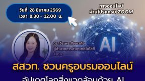 EZ Webmaster March 9, 2026 EZ Webmaster March 9, 2026 สวท. ชวนครูไทยเรียนรู้ AI ฟรี ในโครงการ “AI for Teachers รุ่นที่ 2” เสริมศักยภาพการสอนยุคใหม่ สถาบันส่งเสริมการสอนวิทยาศาสตร์และเทคโนโลยี (สสวท.) ร่วมกับสำนักงานคณะกรรมการการศึกษาขั้นพื้นฐาน (สพฐ.) สำนักงานพัฒนาธุรกรรมทางอิเล็กทรอนิกส์ (สพธอ.) และบริษัท Microsoft (ประเทศไทย) จำกัด เชิญชวนครูผู้สอนทุกสังกัด ทุกระดับชั้น และทุกสาขาวิชา เข้าร่วมอบรมออนไลน์โครงการ “AI for Teachers รุ่นที่ 2” ระหว่างวันที่ 18 – 27 มีนาคม2569 โดยไม่มีค่าใช้จ่าย พร้อมรับประกาศนียบัตร ลงทะเบียนเข้าร่วมอบรมได้ทางเว็บไซต์ https://learn.novituz.com ตั้งแต่วันนี้ถึงวันที่ 27 มีนาคม 2569 ติดตามรายละเอียดและข่าวสารของโครงการได้ทางเฟซบุ๊ก https://www.facebook.com/AIforTeachersTH