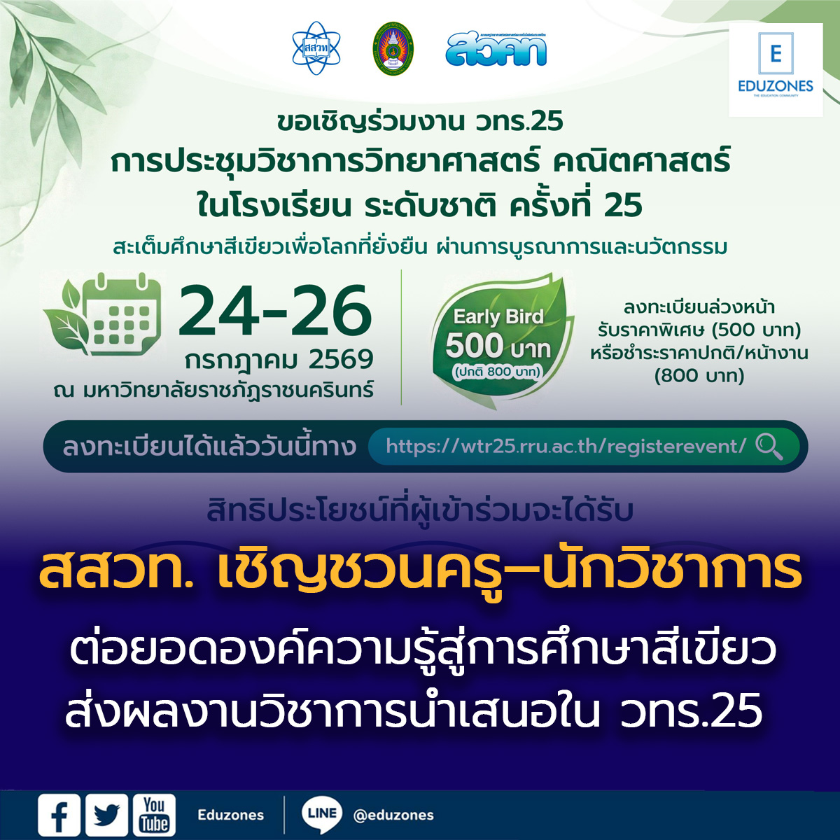 EZ Webmaster March 9, 2026 EZ Webmaster March 9, 2026 ต่อยอดองค์ความรู้สู่การศึกษาสีเขียว สสวท. เชิญชวนครู–นักวิชาการ ส่งผลงานวิชาการนำเสนอใน วทร.25 สถาบันส่งเสริมการสอนวิทยาศาสตร์และเทคโนโลยี (สสวท.) ร่วมกับ มหาวิทยาลัยราชภัฏราชนครินทร์ (มรร.) และ สมาคมวิทยาศาสตร์และคณิตศาสตร์ศึกษาแห่งประเทศไทย (สวคท.) ขอเชิญครู นักการศึกษา นักวิชาการ และผู้สนใจ ส่งผลงานและเข้าร่วมการประชุมวิชาการวิทยาศาสตร์ คณิตศาสตร์ในโรงเรียน ระดับชาติ ครั้งที่ 25 (วทร.25) ภายใต้หัวข้อ “สะเต็มศึกษาสีเขียวเพื่อโลกที่ยั่งยืน ผ่านการบูรณาการและนวัตกรรม” จัดระหว่างวันที่ 24–26 กรกฎาคม 2569 ณ มหาวิทยาลัยราชภัฏราชนครินทร์ จังหวัดฉะเชิงเทรา เวทีวิชาการระดับชาติที่มุ่งแลกเปลี่ยนองค์ความรู้ นวัตกรรม และแนวปฏิบัติด้านวิทยาศาสตร์ คณิตศาสตร์ และสะเต็มศึกษา ขับเคลื่อนการศึกษาไทยเพื่อความยั่งยืน ภายในงานมีการบรรยายพิเศษ เสวนาวิชาการ อบรมเชิงปฏิบัติการ นิทรรศการและการนำเสนอผลงานวิจัย พร้อมคลินิกวิชาการให้คำปรึกษา อัตราค่าลงทะเบียน Early Bird 500 บาท และปกติ/หน้างาน 800 บาท ผู้เข้าร่วมจะได้รับเกียรติบัตร เข้าร่วมกิจกรรมวิชาการได้ 3 เรื่อง (ร่วมกิจกรรมเพิ่มเติมชำระเรื่องละ 100 บาท ) ชมนิทรรศการ รับคำปรึกษา และของที่ระลึก ดูรายละเอียดและส่งผลงานได้ตั้งแต่วันนี้ ถึง 30 มี.ค. 2569 ที่ https://wtr25.rru.ac.th/sywfsc/ ลงทะเบียนเข้าร่วมงานที่ https://wtr25.rru.ac.th/registerevent/