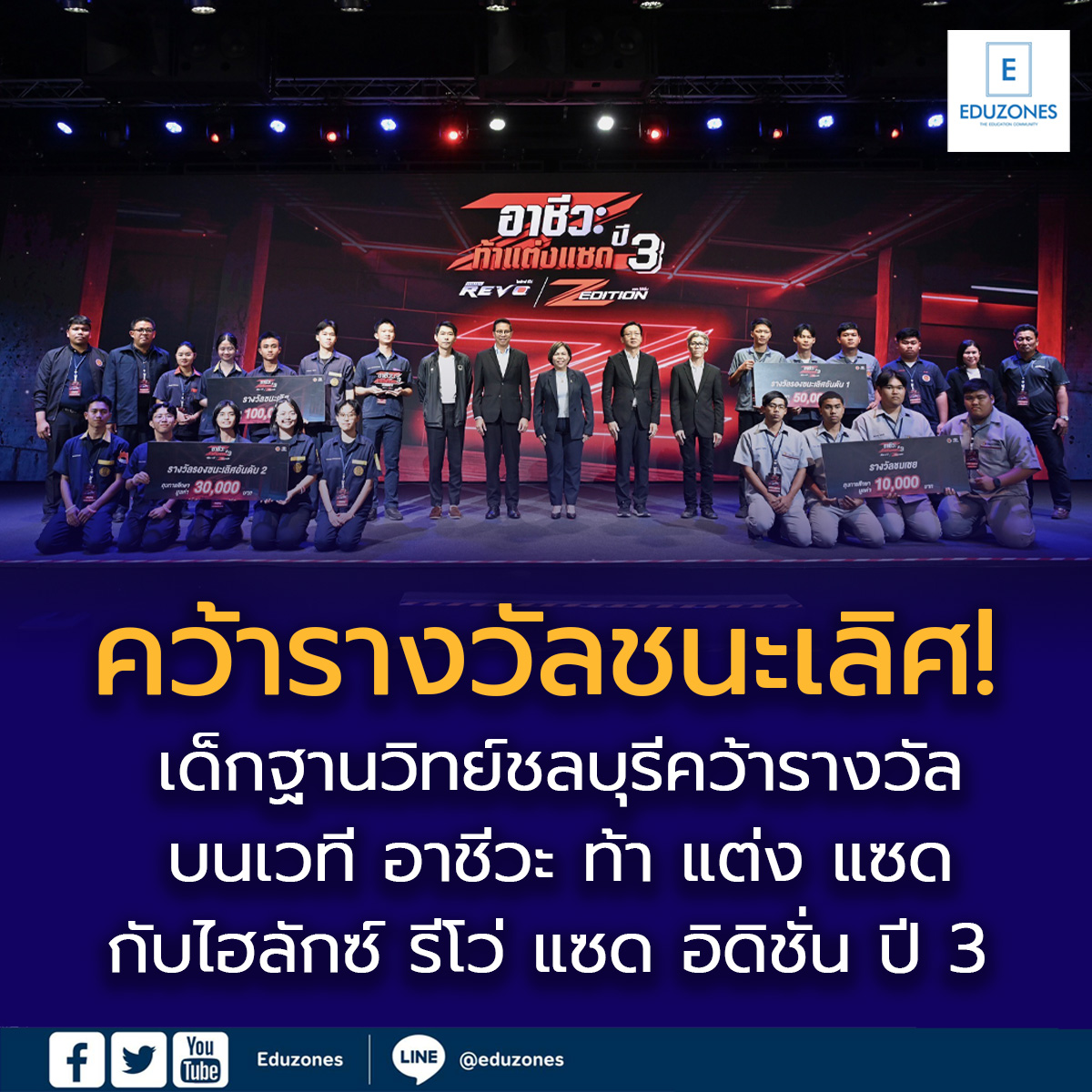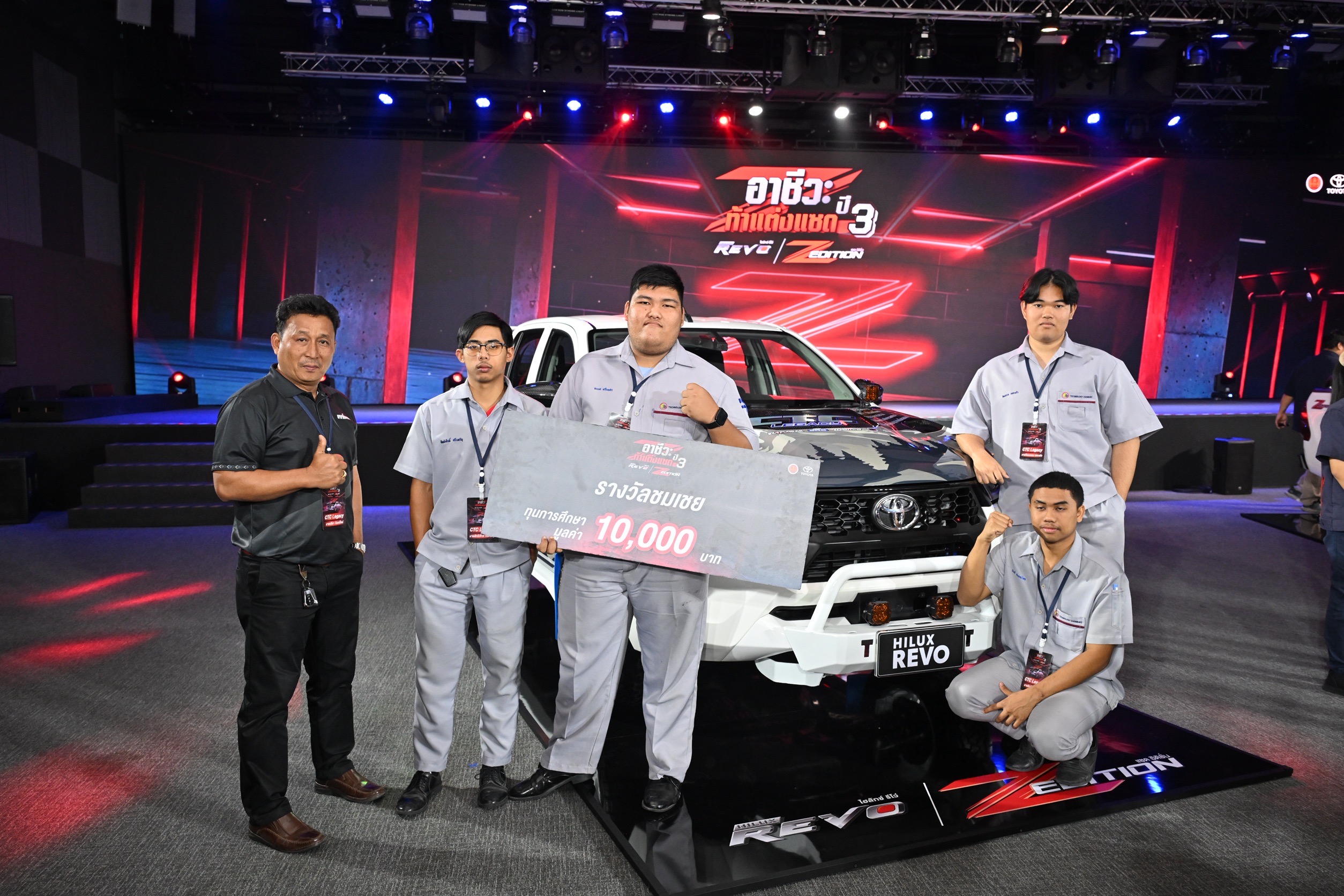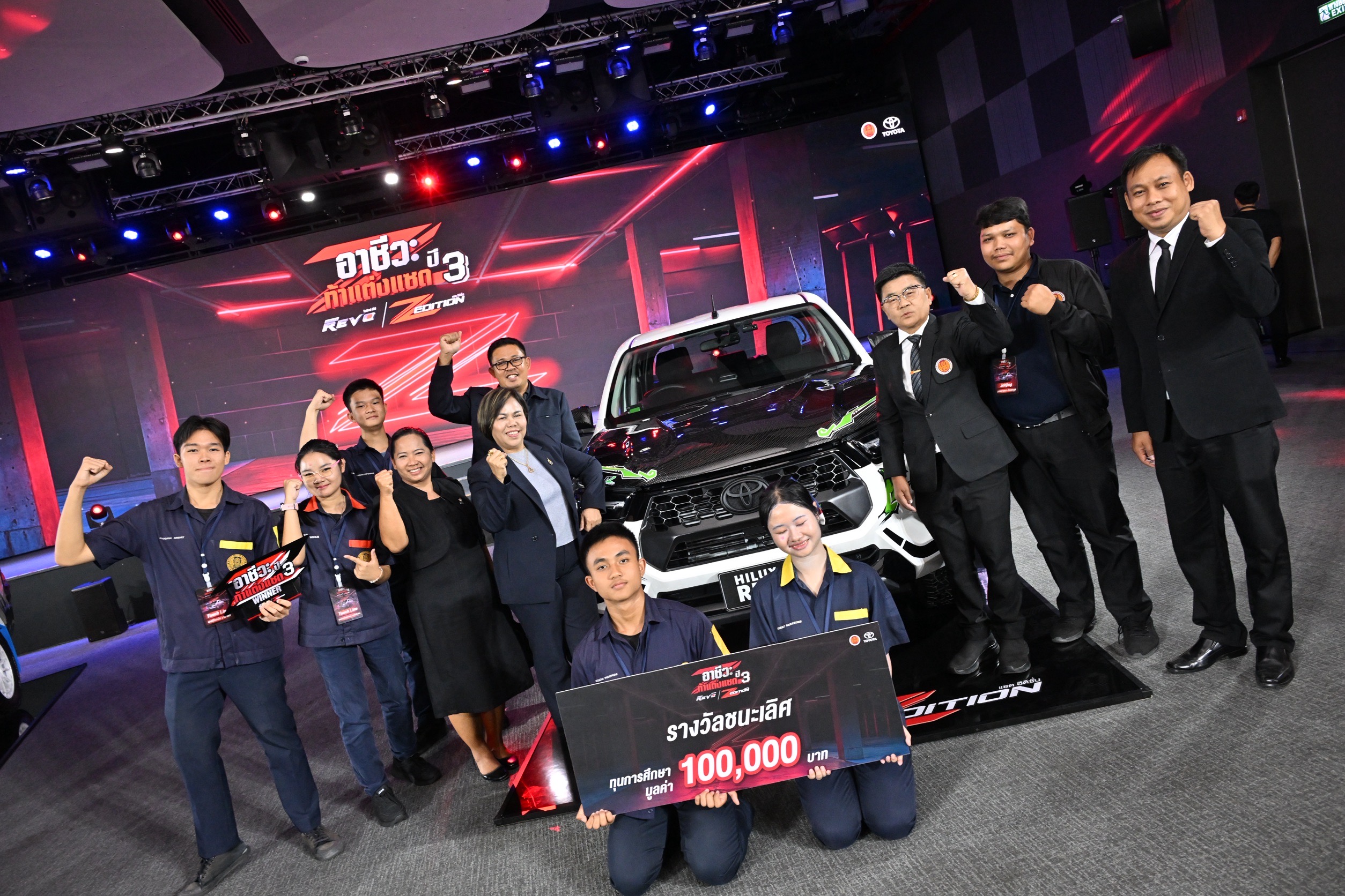 EZ Webmaster March 13, 2026 EZ Webmaster March 13, 2026 เด็กฐานวิทย์ชลบุรีคว้ารางวัลชนะเลิศ! บนเวที อาชีวะ ท้า แต่ง แซด กับไฮลักซ์ รีโว่ แซด อิดิชั่น ปี 3 วันที่ 11 มีนาคม 2569 นายยศพล เวณุโกเศศ เลขาธิการคณะกรรมการการอาชีวศึกษา มอบหมายให้ นางเบญวรรณ ปกป้อง ผู้อำนวยการสำนักความร่วมมือ เป็นประธานในพิธีประกาศผลและมอบรางวัลกิจกรรม อาชีวะ ท้า แต่ง แซด กับไฮลักซ์ รีโว่ แซด อิดิชั่น ปี 3 โดยมีคุณณัทธร ศรีนิเวศน์ ผู้ช่วยกรรมการผู้จัดการใหญ่ บริษัท โตโยต้า มอเตอร์ ประเทศไทย จำกัด คณะผู้บริหารบริษัท โตโยต้า มอเตอร์ ประเทศไทยจำกัด คณะกรรมการผู้ทรงคุณวุฒิ ผู้บริหารสถานศึกษา ครู นักเรียน นักศึกษา เข้าร่วม ณ convention Hall ชั้น 1 Toyota Alive บางนา นางเบญวรรณ ปกป้อง ผู้อำนวยการสำนักความร่วมมือ กล่าวว่า การจัดกิจกรรม “อาชีวะ ท้า แต่ง แซด กับไฮลักซ์ รีโว่ แซด อิดิชั่น ปี 3 ” เป็นความร่วมมือของ สำนักงานคณะกรรมการการอาชีวศึกษา กับ บริษัท โตโยต้า มอเตอร์ ประเทศไทย จำกัด โดยมีวัตถุประสงค์ในการพัฒนาความสามารถของนักเรียนและนักศึกษา ภายใต้สังกัดสำนักงานคณะกรรมการการอาชีวศึกษาทั้งภาครัฐและเอกชน ที่มีความสนใจในการแต่งรถ เปิดโอกาสให้นักเรียน นักศึกษาได้นำความคิดสร้างสรรค์และทักษะการออกแบบมาร่วมพัฒนา แบบรถสำหรับใช้ในการแข่งขัน ซึ่งสอดคล้องกับเป้าหมายสำคัญของอาชีวศึกษา ในการส่งเสริมทักษะ เปลี่ยนความชอบให้เป็นอาชีพที่สามารถต่อยอดได้ในอนาคต และยังเป็นการดึงศักยภาพของนักเรียน นักศึกษา ให้ได้ลงสนามและปฏิบัติงานจริง การแข่งขันในครั้งนี้ไม่เพียงแต่เป็นการท้าทายนักเรียน นักศึกษาให้มีความสามารถ ในการปรับแต่งรถยนต์ตามความคิดสร้างสรรค์ แต่ยังเป็นการเตรียมความพร้อมให้กับนักเรียน นักศึกษาได้เรียนรู้ การทำงานเป็นทีม การเผชิญกับการทำงานในโลกจริง การแลกเปลี่ยนความรู้กับผู้เชี่ยวชาญด้านการตกแต่งรถยนต์ ซึ่งเป็นประสบการณ์ที่มีคุณค่ายิ่ง สอดรับกับนโยบายการขับเคลื่อน “8 Agenda พัฒนาอาชีวศึกษา” ของสำนักงานคณะกรรมการการอาชีวศึกษาที่มุ่งเน้นยกระดับคุณภาพการจัดการศึกษา สร้างผู้เรียนให้มีทักษะที่จำเป็นครบถ้วน ทั้งทักษะวิชาการ ทักษะวิชาชีพ และทักษะชีวิต ผลการแข่งขันในครั้งนี้ 1. รางวัลชนะเลิศ ทีม Touch Line จากวิทยาลัยอาชีวศึกษาเทคโนโลยีฐานวิทยาศาสตร์ (ชลบุรี) จ.ชลบุรี ได้รับทุนการศึกษา 100,000 บาท พร้อมถ้วยรางวัล 2. รางวัลรองชนะเลิศอันดับที่ 1 ทีม ZE86 Chikara จากวิทยาลัยเทคนิคสันกําแพง จ.เชียงใหม่ ได้รับทุนการศึกษา 50,000 บาท 3. รางวัลรองชนะเลิศอันดับที่ 2 ทีม Jokjing จากวิทยาลัยอาชีวศึกษาเทคโนโลยีฐานวิทยาศา