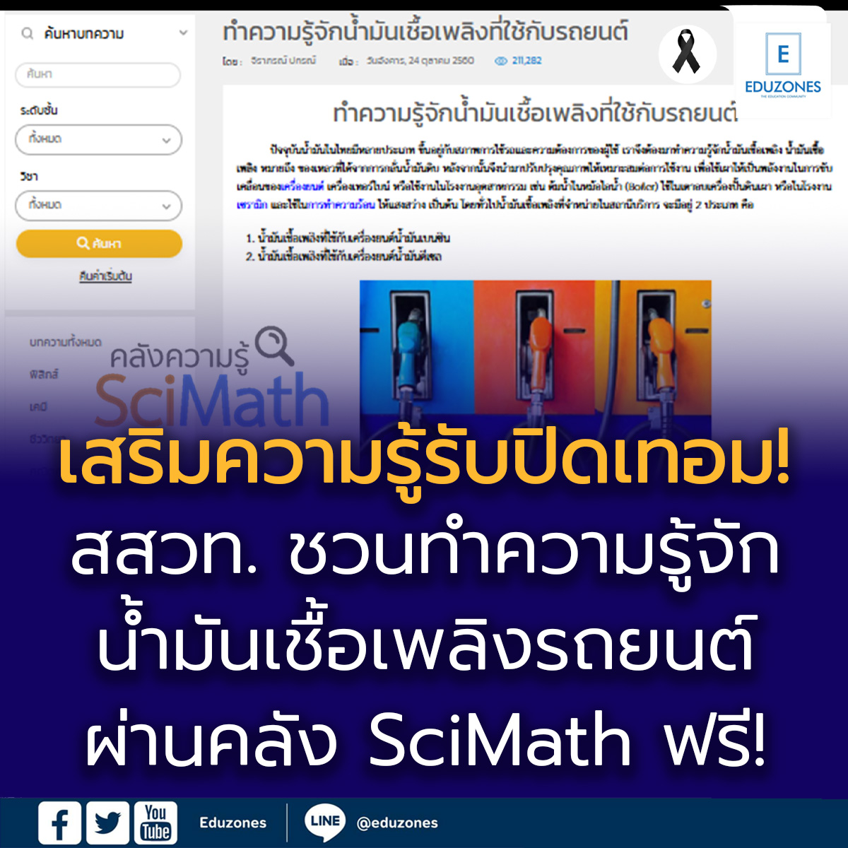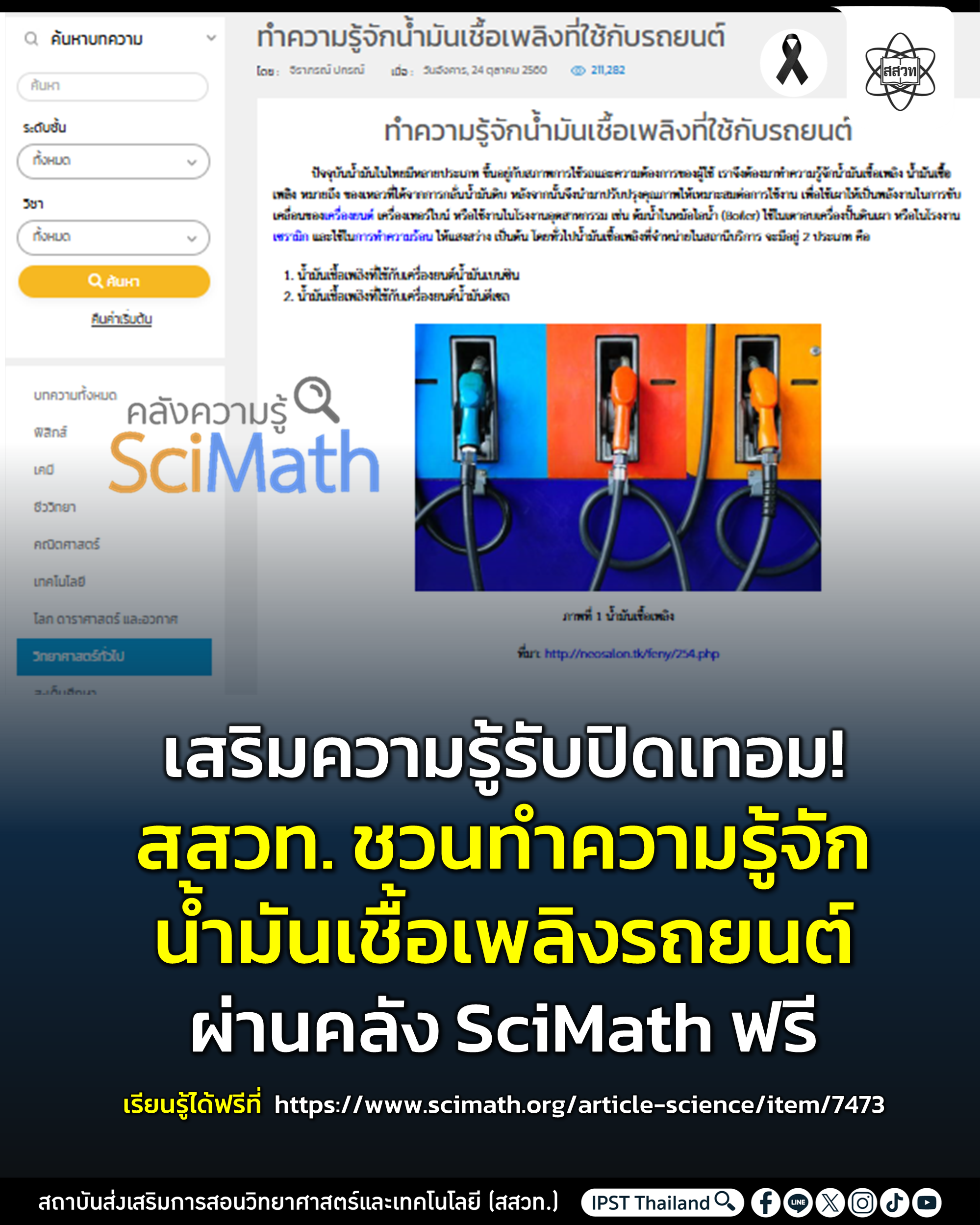 EZ Webmaster March 20, 2026 EZ Webmaster March 20, 2026 เสริมความรู้รับปิดเทอม! สสวท. ชวนทำความรู้จักน้ำมันเชื้อเพลิงรถยนต์ ผ่านคลัง SciMath ฟรี! ท่ามกลางสถานการณ์ราคาน้ำมันที่ผันผวนและมีแนวโน้มสูงขึ้นจากปัจจัยด้านพลังงานโลกทั้งการเปลี่ยนแปลงของตลาดพลังงาน นโยบายสิ่งแวดล้อม และสถานการณ์ระหว่างประเทศที่กระทบต่อการผลิตและขนส่งน้ำมัน ซึ่งส่งผลต่อค่าครองชีพและการใช้ชีวิตในปัจจุบัน สถาบันส่งเสริมการสอนวิทยาศาสตร์และเทคโนโลยี (สสวท.) ชวนเยาวชน ครู และประชาชนทั่วไป เรียนรู้และทำความรู้จักน้ำมันเชื้อเพลิงที่ใช้กับรถยนต์ ผ่านคลังความรู้ SciMath สสวท. ที่อธิบายตั้งแต่ประเภทของน้ำมันเชื้อเพลิง ซึ่งมีคุณสมบัติแตกต่างกันตามลักษณะการเผาไหม้ของเครื่องยนต์ รวมถึงเชื้อเพลิงทางเลือกอย่างแก๊สโซฮอล์ ที่เป็นการผสมเอทานอลกับน้ำมันเบนซินในสัดส่วนต่าง ๆ ตลอดจนแนวทางการเลือกใช้เชื้อเพลิงให้เหมาะสมกับรถยนต์แต่ละประเภท เนื้อหาเข้าใจง่าย เชื่อมโยงกับชีวิตประจำวัน ช่วยเสริมความรู้ด้านวิทยาศาสตร์พลังงานและการใช้ทรัพยากรอย่างรู้คุณค่า เรียนรู้ได้ฟรีที่ https://www.scimath.org/article-science/item/7473