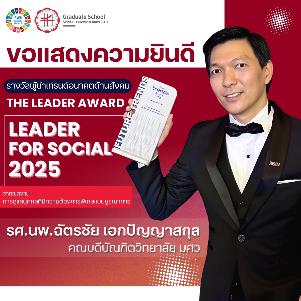 EZ Webmaster March 21, 2026 EZ Webmaster March 21, 2026 “อาจารย์หมอฉัตรชัย” มศว กับความสำเร็จของหลักสูตร เพื่อ “เด็กพิเศษ” แบบบูรณาการ คว้ารางวัล “ผู้นำเทรนด์อนาคตด้านสังคม” ปัจจุบันสถานการณ์ “เด็กพิเศษ” หรือ บุคคลผู้มีความต้องการพิเศษ ( บุคคลที่มีความบกพร่องทางร่างกาย สติปัญญา อารมณ์ พฤติกรรม หรือการเรียนรู้ ) ซึ่งจากข้อมูลปี 2568 โดยยูนิเซฟพบว่าเด็กออทิสติกและสมาธิสั้นมีแนวโน้มเพิ่มขึ้นอย่างรวดเร็วทั้งในไทยและระดับโลก และเป็นกลุ่มใหญ่ที่ต้องการการศึกษาพิเศษเพื่อให้การฟื้นฟูเยียวยาตลอดจนโอกาสทางอาชีพ ให้พวกเขาสามารถใช้ชีวิตร่วมกับผู้อื่นในสังคมได้อย่างปกติสุขในรูปแบบของ ‘จากบ้านสู่สังคมที่เท่าเทียม’ “อาจารย์หมอฉัตรชัย” (รองศาสตราจารย์ นายแพทย์ฉัตรชัย เอกปัญญาสกุล) คณบดีบัณฑิตวิทยาลัย มหาวิทยาลัยศรีนครินทรวิโรฒ (มศว) ผู้ได้รับรางวัลผู้นำเทรนด์แห่งปีระดับนานาชาติ “ผู้นำเทรนด์อนาคตด้านสังคม” เพื่อการดูแลบุคคลที่มีความต้องการพิเศษแบบบูรณาการ เพราะมีความตั้งใจที่จะพัฒนาศักยภาพ เพิ่มทักษะการเรียนรู้และขีดความสามารถพิเศษของ “เด็กพิเศษ” ให้เห็นผลได้จริง เพื่อให้พวกเขาช่วยเหลือตนเองได้โดยการริเริ่มเปิด หลักสูตรประกาศนียบัตรบัณฑิต สาขาวิชาการศึกษาพิเศษและการดูแล เพื่อการดูแลเด็กพิเศษแบบบูรณาการ “ตอนผมเรียนแพทย์และไปใช้ทุนที่อำเภอวัฒนานคร จ.สระแก้ว ก็คิดว่าทำไมเราตรวจคนไข้แล้วส่วนใหญ่เจอแต่โรคเดิมๆ เช่น ความดัน เบาหวานเพราะคุมน้ำตาลไม่ได้ ซึ่งถ้าเรามีเวลามากพอก็จะคุยวิธีการดูแลปฏิบัติตัวให้กับคนไข้ได้เป็นรายๆ แต่เพราะมีคนไข้วันละร้อยๆ คนต่อวัน เราเลยมีเวลาคุยกับคนไข้น้อยมาก ซึ่งทุกวันนี้ถ้าผมมีลงตรวจคนไข้ที่คลินิก มศว ก็จะพยายามซักคนไข้นานหน่อยเพื่อเน้นเรื่องการดูแลตัวเอง จะได้ไม่ต้องพึ่งยาหรือมาหาหมอโดยไม่จำเป็น มาคิดว่าเราน่าจะช่วยเหลือคนได้มากกว่านี้ เลยตัดสินใจเรียนแพทย์ในสาขา เวชศาสตร์ป้องกันและสังคม เป็นวิชาการแพทย์เชิงป้องกัน สุขภาพชุมชนและระบาดวิทยา เพื่อให้แพทย์มีความรู้ความเข้าใจเรื่องสุขภาพในระดับประชากร ชุมชนและการป้องกันโรคมากกว่าการรักษาเพียงอย่างเดียว ซึ่งตอนนั้นก็ไม่น่าจะมีหมอคนไหนอยากเรียนสักเท่าไหร่ คือผมคิดว่าถ้าเราช่วยสังคมได้มันจะเกิด impact ได้มากกว่า การดูแลคนไข้เป็นรายๆ ไปนั่นแหล่ะ ที่สุดก็ได้ทุนไปเรียนที่ภาควิชาเวชศาสตร์ป้องกันและสังคมที่จุฬาลงกรณมหาวิทยาลัย 3 ปี และไปสอบเพิ่มเป็นผู้เชี่ยวชาญสุขภาพจิตชุมชน สาขาระบาดวิทยา ตอนนั้นก็ควบงานเรื่องการดูแ
