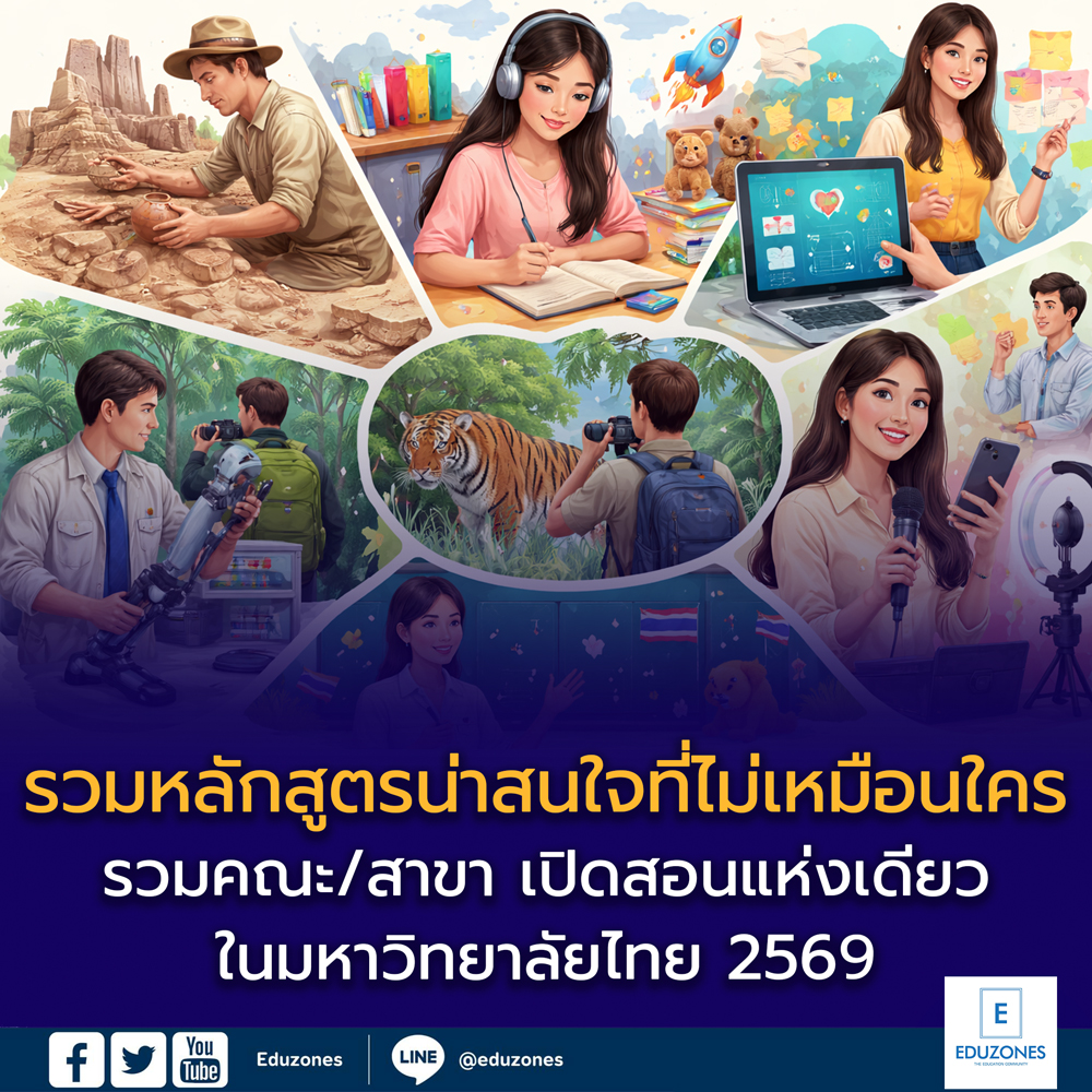 ชวนเยาวชนไทยอัปสกิลเอาตัวรอดยุคโลกเปลี่ยน! “Power Green Camp 21” เปิดรับสมัครแล้ว EZ WebmasterMarch 20, 2026 🌍 ชวนเยาวชนไทยอัปสกิลเอาตัวรอดยุคโลกเปลี่ยน! “Power Green Camp 21” เปิดรับสมัครแล้ว ในยุคที่โลกเผชิญความท้าทายรอบด้าน ทั้งสภาพอากาศแปรปรวน โรคระบาด มลพิษทางอากาศ และภัยพิบัติที่เกิดขึ้นอย่างต่อเนื่อง คำถามสำคัญคือ “เราพร้อมรับมือกับโลกแบบนี้แล้วหรือยัง?” เพื่อเตรียมความพร้อมให้กับเยาวชนไทย โครงการ Power Green… รายงานความสุขโลก 2026 (World Happiness Report) 10 อันดับประเทศที่มีความสุขที่สุดในโลก และประเทศไทยอยู่อันดับไหน? EZ WebmasterMarch 20, 2026 รายงานความสุขโลก 2026 (World Happiness Report) 10 อันดับประเทศที่มีความสุขที่สุด และประเทศไทยอยู่อันดับไหน? ในยุคที่โลกเผชิญความเปลี่ยนแปลงทั้งเศรษฐกิจ สังคม และเทคโนโลยี“ความสุขของประชาชน” กลายเป็นตัวชี้วัดสำคัญของคุณภาพชีวิตในแต่ละประเทศ รายงาน World Happiness Report ประจำปี 2568–2569จึงเป็นหนึ่งในดัชนีระดับโลกที่สะท้อนว่า… 🎓 จุฬาฯ ชวนเปิดโลกการเรียนรู้ในงาน CU Open House 2026 ค้นหาเส้นทางอนาคต 28–29 มี.ค. นี้ EZ WebmasterMarch 18, 2026 🎓 จุฬาฯ ชวนเปิดโลกการเรียนรู้ในงาน CU Open House 2026 ค้นหาเส้นทางอนาคต 28–29 มี.ค. นี้ จุฬาลงกรณ์มหาวิทยาลัย เชิญชวนนักเรียน ผู้ปกครอง และผู้ที่สนใจ ร่วมเปิดประสบการณ์การเรียนรู้ในงาน CU Open… โรงเรียนนานาชาติจีน (CIS) จัดใหญ่ Open House 2026 ปั้นรากฐานเด็กประถม พร้อมยกระดับมัธยมปลายสู่มหาวิทยาลัยชั้นนำระดับโลก tui sakrapeeMarch 17, 2026 โรงเรียนนานาชาติจีน (China International School – CIS) ประสบความสำเร็จอย่างยิ่งในการจัดงาน Open House 2026 ภายใต้แนวคิด “China Now, Future Ready เปิดประตูสู่โลกอนาคตกับต้นฉบับโรงเรียนนานาชาติจีน” เมื่อวันที่ 14… Search for: Search EZ Webmaster March 25, 2026 EZ Webmaster March 25, 2026 รวมคณะ/สาขาที่เปิดสอนแห่งเดียวในไทย 2569 : รวมหลักสูตรน่าสนใจที่ไม่เหมือนใคร รวมคณะ/สาขาที่เปิดสอนแห่งเดียวในไทย 2569 : รวมหลักสูตรน่าสนใจที่ไม่เหมือนใคร เวลาพูดถึงการเลือกคณะหรือสาขาเรียนต่อ หลายคนมักนึกถึงตัวเลือกยอดนิยมอย่างแพทยศาสตร์ วิศวกรรมศาสตร์ นิเทศศาสตร์ หรือบริหารธุรกิจก่อนเสมอ แต่จริง ๆ แล้วในระบบอุดมศึกษาไทยยังมีอีกหลายหลักสูตรที่น่าสนใจมาก และบางหลักสูตรก็เปิดสอนเพียง แห่งเดียวในประเทศไทย เท่านั้น จุดเด่นของหลักสูตรเหล่านี้คือความเฉพาะทางสูง มีอัตลักษณ์ชัดเจน และหลายสาขายังเชื่อมโยงกับอาชีพยุคใหม่โดยตรง ไม่ว่าจะเป็นสายอนุรักษ์มรดกวัฒนธรรม สายสุขภาพยุคดิจิทัล สายพัฒนามนุษย์ หรือสายอุตสาหกรรมบันเทิงสมัยใหม่ สำหรับน้อง ๆ ที่กำลังมองหาทางเลือกเรียนต่อแบบ “ไม่เหมือนใคร” บทความนี้ Eduzones รวบรวมมาให้แล้ว กับ 8 สาขา/หลักสูตรปริญญาตรีที่เปิดสอนแห่งเดียวใ