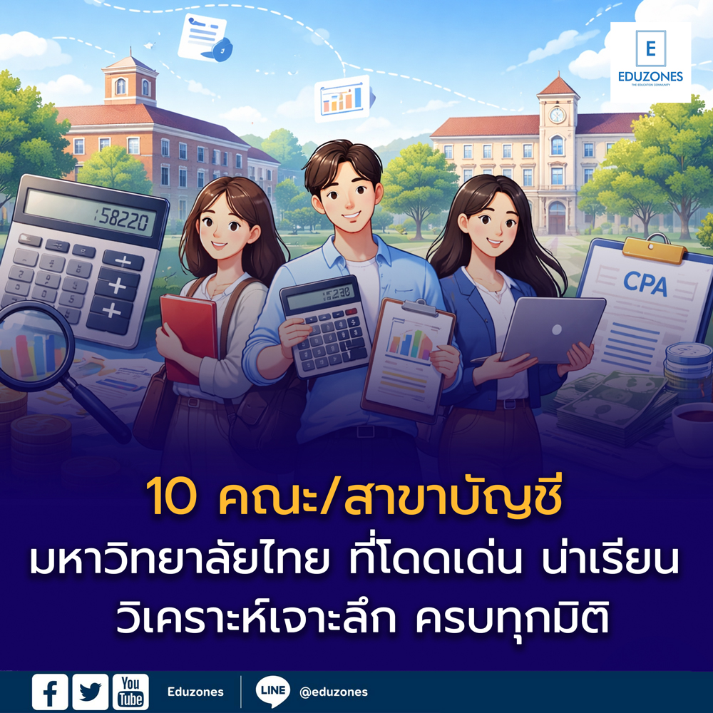 10 มหาวิทยาลัยไทย ที่มีคณะ/สาขาบัญชี ที่โดดเด่น “วิเคราะห์ลึก ครบทุกมิติ” EZ WebmasterMarch 30, 2026 10 มหาวิทยาลัยไทย ที่มีคณะ/สาขาบัญชี ที่โดดเด่น “วิเคราะห์ลึก ครบทุกมิติ” ฉบับเจาะลึก | อัปเดตปี 2568–2569 โดย กองบรรณาธิการ Eduzones ทำไมบัญชีถึงยัง “น่าเรียน” ในยุค AI? มีคนถามว่า…
