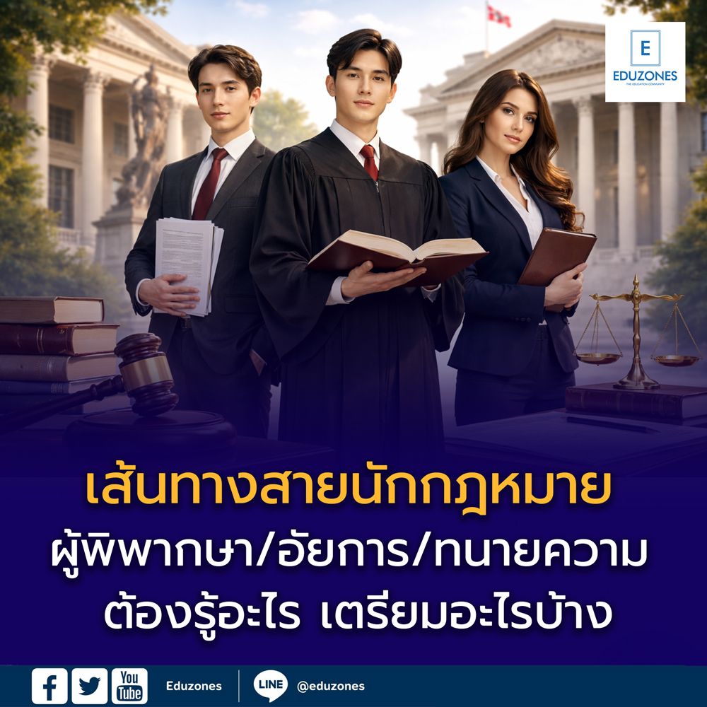 คณะบริหารธุรกิจ ม.หอการค้าไทย จับมือ “ท่ามหาราช” เปิดตลาดซัมเมอร์สุดยิ่งใหญ่ “INTERFAIR 2026” เสริมทักษะนักศึกษาสู่เวทีธุรกิจนานาชาติ EZ WebmasterMarch 30, 2026 กรุงเทพฯ: คณะบริหารธุรกิจ มหาวิทยาลัยหอการค้าไทย (UTCC) โดยนักศึกษาสาขาบริหารธุรกิจระหว่างประเทศ เปิดตัวโครงการเรียนรู้เชิงปฏิบัติ “INTERFAIR 2026 : Thai Summer InterFair Market 2026” จัดขึ้นระหว่างวันที่ 24 – 26… ชวนเยาวชนไทยอัปสกิลเอาตัวรอดยุคโลกเปลี่ยน! “Power Green Camp 21” เปิดรับสมัครแล้ว EZ WebmasterMarch 20, 2026 🌍 ชวนเยาวชนไทยอัปสกิลเอาตัวรอดยุคโลกเปลี่ยน! “Power Green Camp 21” เปิดรับสมัครแล้ว ในยุคที่โลกเผชิญความท้าทายรอบด้าน ทั้งสภาพอากาศแปรปรวน โรคระบาด มลพิษทางอากาศ และภัยพิบัติที่เกิดขึ้นอย่างต่อเนื่อง คำถามสำคัญคือ “เราพร้อมรับมือกับโลกแบบนี้แล้วหรือยัง?” เพื่อเตรียมความพร้อมให้กับเยาวชนไทย โครงการ Power Green… รายงานความสุขโลก 2026 (World Happiness Report) 10 อันดับประเทศที่มีความสุขที่สุดในโลก และประเทศไทยอยู่อันดับไหน? EZ WebmasterMarch 20, 2026 รายงานความสุขโลก 2026 (World Happiness Report) 10 อันดับประเทศที่มีความสุขที่สุด และประเทศไทยอยู่อันดับไหน? ในยุคที่โลกเผชิญความเปลี่ยนแปลงทั้งเศรษฐกิจ สังคม และเทคโนโลยี“ความสุขของประชาชน” กลายเป็นตัวชี้วัดสำคัญของคุณภาพชีวิตในแต่ละประเทศ รายงาน World Happiness Report ประจำปี 2568–2569จึงเป็นหนึ่งในดัชนีระดับโลกที่สะท้อนว่า… 🎓 จุฬาฯ ชวนเปิดโลกการเรียนรู้ในงาน CU Open House 2026 ค้นหาเส้นทางอนาคต 28–29 มี.ค. นี้ EZ WebmasterMarch 18, 2026 🎓 จุฬาฯ ชวนเปิดโลกการเรียนรู้ในงาน CU Open House 2026 ค้นหาเส้นทางอนาคต 28–29 มี.ค. นี้ จุฬาลงกรณ์มหาวิทยาลัย เชิญชวนนักเรียน ผู้ปกครอง และผู้ที่สนใจ ร่วมเปิดประสบการณ์การเรียนรู้ในงาน CU Open… Search for: Search EZ Webmaster March 30, 2026 EZ Webmaster March 30, 2026 เส้นทางสายนักกฎหมายก่อนจะเป็น ผู้พิพากษา • อัยการ • ทนายความ เตรียมตัวอย่างไร เส้นทางสายนักกฎหมายก่อนจะเป็น ผู้พิพากษา • อัยการ • ทนายความ เตรียมตัวอย่างไร วิชาที่ใช้สอบ | สถาบันที่เปิดสอน | ค่าใช้จ่าย | เงินเดือน โดย กองบรรณาธิการ Eduzones “กฎหมายคือเกราะคุ้มครองสิทธิเสรีภาพของประชาชน และผู้ที่เลือกเดินในเส้นทางนี้คือผู้ที่ถือเกราะนั้นไว้ในมือ” สายกฎหมายคือหนึ่งในเส้นทางวิชาชีพที่มีเกียรติและมีความสำคัญต่อระบบยุติธรรมของสังคมมากที่สุด ไม่ว่าจะเป็น ผู้พิพากษา ที่ทำหน้าที่ตัดสินชี้ขาดคดีความในพระปรมาภิไธยพระมหากษัตริย์ อัยการ ที่ทำหน้าที่อัยการโจทก์และพิทักษ์ผลประโยชน์ของรัฐและประชาชน หรือ ทนายความ ที่ปกป้องสิทธิเสรีภาพของลูกความ ทุกอาชีพในสายนี้ล้วนต้องการ “ความรู้กฎหมายที่แน่น” “ความอดทนสูง” และ “จริยธรรมที่ไม่สั่นคลอน” สำหรับน้อง