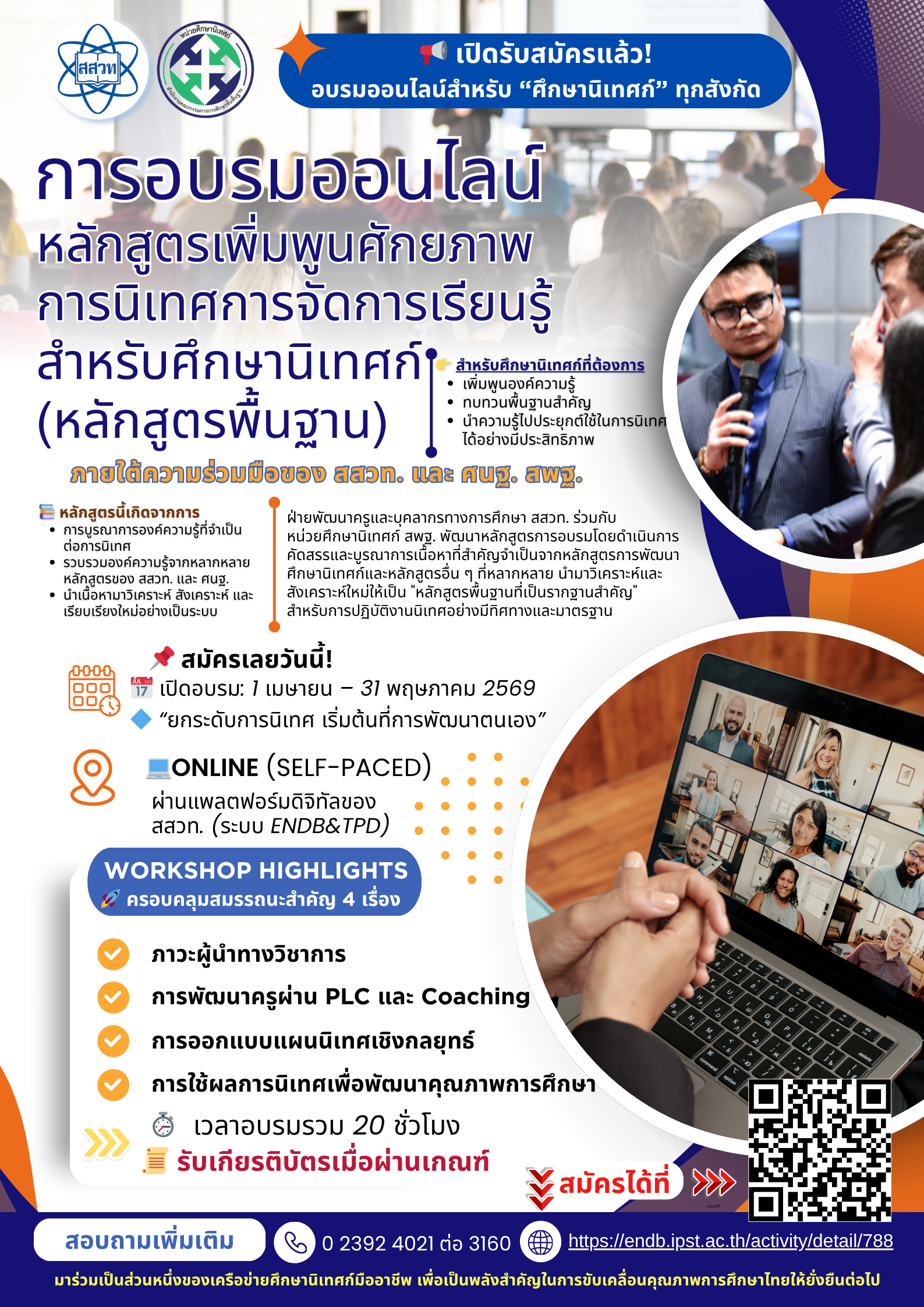 สถาบันส่งเสริมการสอนวิทยาศาสตร์และเทคโนโลยี (สสวท.) ร่วมกับหน่วยศึกษานิเทศก์ สำนักงานคณะกรรมการการศึกษาขั้นพื้นฐาน (สพฐ.) เปิดรับสมัครศึกษานิเทศก์ทุกสังกัด เข้าร่วมการอบรมออนไลน์ “หลักสูตรเพิ่มพูนศักยภาพการนิเทศการจัดการเรียนรู้ (หลักสูตรพื้นฐาน)” เพื่อเสริมสร้างและทบทวนองค์ความรู้ที่จำเป็นต่อการนิเทศชั้นเรียนอย่างเป็นระบบและมีประสิทธิภาพ โดยเชื่อมโยงการทำงานของศึกษานิเทศก์กับการยกระดับคุณภาพการจัดการเรียนรู้ในสถานศึกษา ผ่านรูปแบบการเรียนรู้ด้วยตนเอง (Self-Paced) บนแพลตฟอร์มดิจิทัลของ สสวท. ระหว่างวันที่ 1 เมษายน – 31 พฤษภาคม 2569 หลักสูตรนี้มุ่งเน้นการพัฒนาสมรรถนะสำคัญ 4 ด้าน ได้แก่ ภาวะผู้นำทางวิชาการ การพัฒนาครูผ่าน PLC และ Coaching การออกแบบแผนนิเทศเชิงกลยุทธ์ และการใช้ผลการนิเทศเพื่อพัฒนาคุณภาพการศึกษา ระยะเวลาอบรม 20 ชั่วโมง พร้อมรับเกียรติบัตรเมื่อผ่านเกณฑ์ ศึกษารายละเอียดและสมัครอบรมได้ที่ https://endb.ipst.ac.th/activity/detail/788 สอบถามเพิ่มเติมที่ ฝ่ายพัฒนาครูและบุคลากรทางการศึกษา สสวท.  โทร. 0 2392 4021 ต่อ 3160