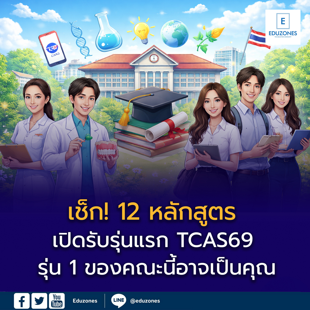 EZ Webmaster April 7, 2026 EZ Webmaster April 7, 2026 เช็ก! 12 หลักสูตร “เปิดรับรุ่นแรก TCAS69” — อัปเดตปี 2569 รุ่น 1 ของคณะนี้อาจเป็นคุณ! 🎓 เช็ก! 12 หลักสูตร “เปิดรับรุ่นแรก TCAS69” — อัปเดตปี 2569 รุ่น 1 ของคณะนี้อาจเป็นคุณ! สำหรับน้อง ๆ Dek69 ที่กำลังมองหา “หลักสูตรใหม่” หรืออยากเป็น รุ่นที่ 1 ของคณะ/สาขา ปีการศึกษา 2569 ถือเป็นอีกปีที่หลายมหาวิทยาลัยเปิดหลักสูตรใหม่เพื่อตอบโจทย์โลกยุคปัจจุบัน ทั้งสายสุขภาพ เทคโนโลยี และธุรกิจสมัยใหม่ 👉 ทีมงาน Eduzones คัดมาให้แล้ว 12 หลักสูตรที่ “เปิดรับนักศึกษารุ่นแรกใน TCAS69 จริง” โดยอ้างอิงจากข้อมูลมหาวิทยาลัยและระบบรับสมัครโดยตรง 📅 อัปเดต: ปีการศึกษา 2569 🏥 กลุ่มสุขภาพ (Health Sciences) 01 | ทันตแพทยศาสตรบัณฑิต (Bilingual Program) — มหาวิทยาลัยศรีนครินทรวิโรฒ หลักสูตรทันตแพทย์ 2 ภาษา (ไทย–อังกฤษ) ที่ออกแบบมาเพื่อพัฒนาทันตแพทย์ยุคใหม่ให้ทำงานในระดับสากล 📌 เปิดรับนิสิต รุ่นแรกในปีการศึกษา 2569 🔗 https://dent.swu.ac.th 02 | วิทยาศาสตรบัณฑิต สาขาวิทยาศาสตร์การแพทย์ — มหาวิทยาลัยศรีนครินทรวิโรฒ อีกหนึ่งสาขาน้องใหม่ของคณะแพทยศาสตร์ มศว เหมาะกับน้องที่อยากทำงานสายวิจัย ห้องแล็บ หรืออุตสาหกรรมสุขภาพ 📌 เปิดรับ รุ่นแรก TCAS69 🔗 https://med.swu.ac.th 03 | วิทยาศาสตรบัณฑิต สาขาจิตวิทยาคลินิก — มหาวิทยาลัยทักษิณ หลักสูตรด้านสุขภาพจิตที่กำลังเป็นที่ต้องการสูงในปัจจุบัน 📌 หลักสูตรใหม่ พ.ศ.2569 📌 รับนักศึกษารุ่นแรกปีนี้ 🔗 https://ahs.tsu.ac.th 04 | เภสัชศาสตรบัณฑิต — สถาบันพระบรมราชชนก หนึ่งในหลักสูตรใหม่ในระบบผลิตบุคลากรสุขภาพของรัฐ 📌 เปิดรับใน TCAS69 เป็นปีแรก 🔗 https://pbri-admission.pi.ac.th 05 | ทันตแพทยศาสตรบัณฑิต — สถาบันพระบรมราชชนก ขยายโอกาสเรียนทันตแพทย์สู่ภูมิภาคมากขึ้น 📌 เปิดรับ รุ่นแรกปี 2569 🔗 https://pbri-admission.pi.ac.th 🌱 กลุ่มธุรกิจ / อนาคต / สหวิทยาการ 06 | วิทยาศาสตรบัณฑิต สาขาการจัดการเพื่อความยั่งยืน (SUMA) — มหาวิทยาลัยธรรมศาสตร์ หลักสูตรที่ตอบโจทย์โลก ESG และธุรกิจยุคใหม่ 📌 เปิดสอนครั้งแรก ปีการศึกษา 2569 🔗 https://www.thammasat.ac.th 07 | บริหารธุรกิจบัณฑิต (Inter) สาขาการจัดการธุรกิจแบบบูรณาการ — มหาวิทยาลัยธรรมศาสตร์ หลักสูตรนานาชาติที่เน้นการบริหารธุรกิจแบบผสมผสาน 📌 เปิดรับใน TCAS69 🔗 https://course.mytcas.com 08 | ศิลปศาสตรบัณฑิต สาขาศักยภาพมนุษย์และสุขภาวะ — มหาวิทยาลัยธรรมศาสตร์ สาขาใหม่ที่เน้นการพัฒนามนุษย์และคุณภาพชีวิต 📌 หลักสูตรใหม่ 2569 📌 เปิดรับรุ่นแรก 🔗 https://tu.ac.th 💻 กลุ่มเทคโนโลยี / วิทยาศาสตร์ 09 | วิทยาศาสตรบัณฑิต สาขาดิจิทัลและ AI ทางการแพทย์ — มหาวิทยาลัยทักษิณ ผสาน AI กับการแพทย์ รองรับอนาคต HealthTech 📌 หลักสูตรใหม่ 2569 📌 เปิดรับแล้วใน TCAS69 🔗 https://entrance.tsu.ac.th 10 | วิทยาศาสตรบัณฑิต สาขาเทคโนโลยีชีวภาพ — มหาวิทยาลัยทักษิ