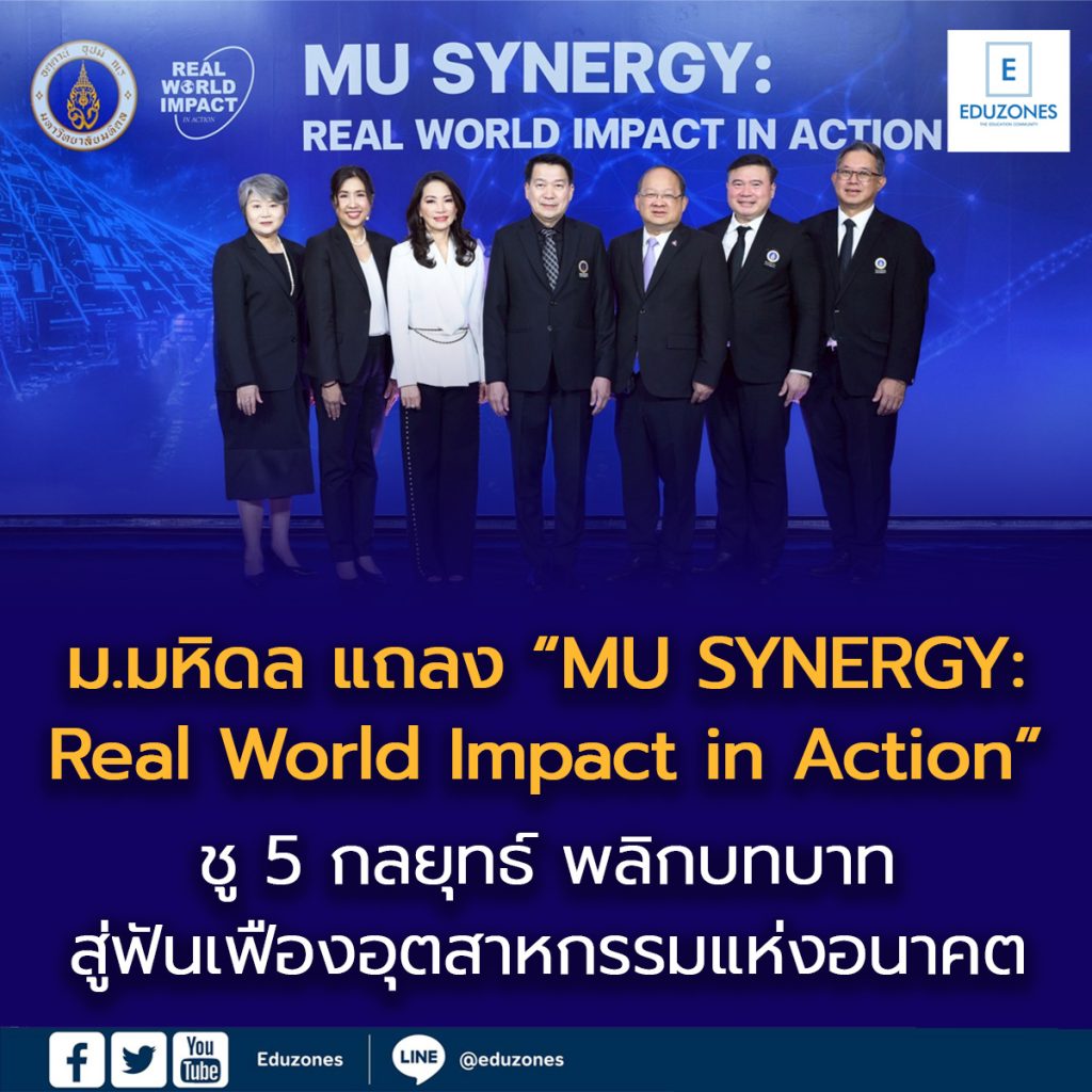 EZ Webmaster April 8, 2026 EZ Webmaster April 8, 2026 ม.มหิดล แถลง “MU SYNERGY: Real World Impact in Action” ชู 5 กลยุทธ์ พลิกบทบาทสู่ฟันเฟืองอุตสาหกรรมแห่งอนาคต กรุงเทพฯ 7 เมษายน 2569 – ศาสตราจารย์ นายแพทย์ ปิยะมิตร ศรีธรา ( คนที่ 4 จากซ้าย) อธิการบดีมหาวิทยาลัยมหิดล นางสาวจรีพร จารุกรสกุล ( คนที่ 3 จากซ้าย) ประธานคณะกรรมการบริหารและประธานเจ้าหน้าที่บริหารกลุ่ม บริษัท ดับบลิวเอชเอ คอร์ปอเรชั่น จำกัด (มหาชน) และ นายเกรียงไกร เธียรนุกุล ( คนที่ 5 จากซ้าย) ประธานสภาอุตสาหกรรมแห่งประเทศ พร้อมด้วยคณะผู้บริหาร ร่วมงานแถลงข่าว “MU SYNERGY: Real World Impact in Action” เผย 5 กลยุทธ์ พลิกบทบาทมหาวิทยาลัยสู่ฟันเฟืองหลักในการขับเคลื่อนเศรษฐกิจ ดึงดูดการลงทุนระดับโลก และเพิ่มมูลค่า GDP ของประเทศ มุ่งพัฒนาอุตสาหกรรมแห่งอนาคต ควบคู่การยกระดับทักษะกำลังคน เพื่อเสริมขีดความสามารถการแข่งขันในเวทีโลก โดยงานดังกล่าว จัดขึ้น ณ โรงแรมสยาม เคมปินสกี้ เมื่อเร็วๆ นี้