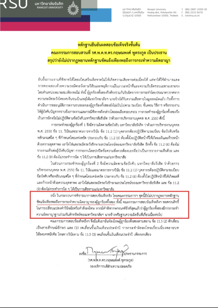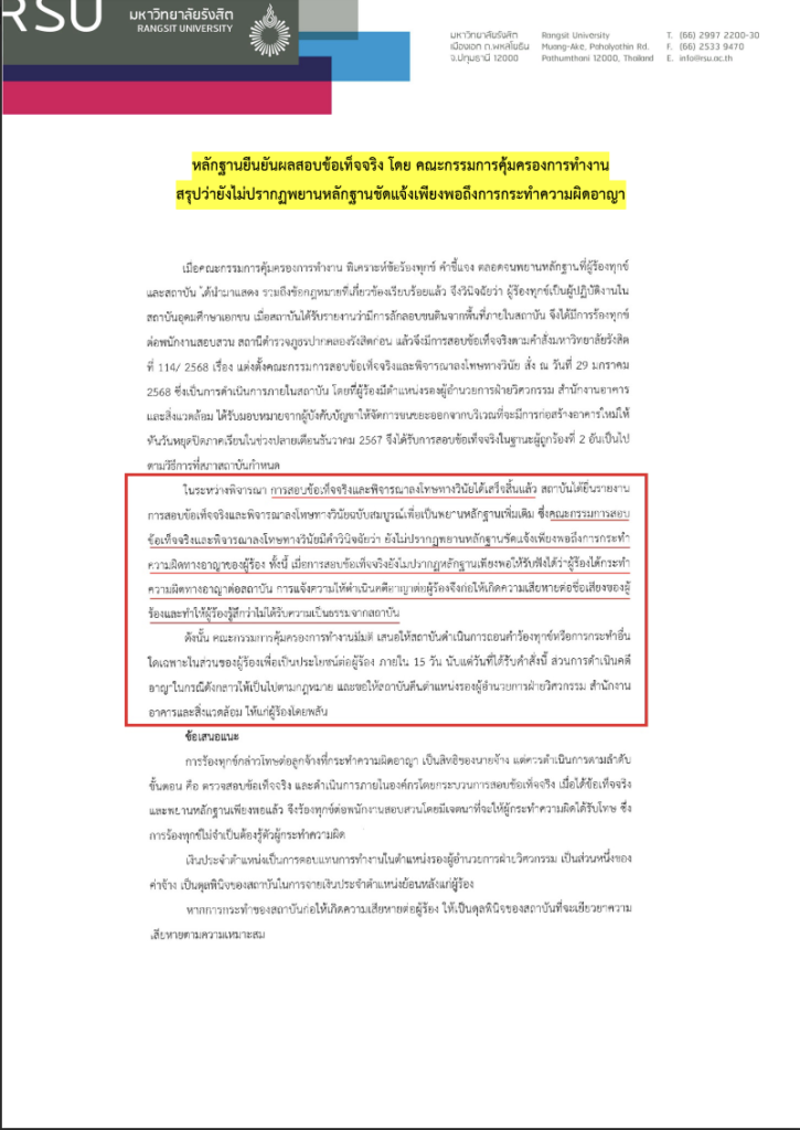 EZ Webmaster April 8, 2026 EZ Webmaster April 8, 2026 มหาวิทยาลัยรังสิต ออกแถลงการณ์ชี้แจงข้อเท็จจริง แถลงการณ์มหาวิทยาลัยรังสิต สืบเนื่องจากการแถลงข่าวของ รองศาสตราจารย์ พันตำรวจโท ดร.กฤษณพงศ์ พูตระกูล ในวันนี้ (7 เม.ย.69) ซึ่งพบว่ายังคงมีการนำเสนอข้อมูลที่บิดเบือน และคลาดเคลื่อนจากความเป็นจริง มหาวิทยาลัยรังสิตขอชี้แจงข้อเท็จจริงในประเด็นดังกล่าว โดยอาศัยข้อมูลจากข้อเท็จจริงต่างๆ พิจารณาอย่างรอบด้าน เพื่อมิให้เกิดความสับสนในการร่วมสร้างสถานการณ์ที่ไม่ดีขึ้นแต่อย่างใด จากการกล่าวหาว่ามหาวิทยาลัยรังสิตปกป้องผู้กระทำความผิด ในกรณีการทุจริตจัดซื้อพัสดุ มหาวิทยาลัยรังสิต ขอชี้แจงข้อเท็จจริงเพื่อสร้างความเข้าใจที่ถูกต้อง ดังนี้ กรณีนี้ไม่ใช่คดีทุจริตพัสดุ ซึ่งผลสอบสวนชี้ว่า มี ศ.ท.ท.ดร.กฤษณพงศ์ พูตระกูล เป็นประธานกรรมการสอบสวนชั้นต้น สรุปว่าไม่มีหลักฐานเพียงพอที่จะดำเนินคดีอาญาได้ รวมถึงผลสอบสวนในชั้นอุทธรณ์ โดยคณะกรรมการอุทธรณ์ที่เกี่ยวข้อง ก็มีมติเป็นเอกฉันท์ว่า นอกจากไม่มีความผิดทางอาญาแล้ว ไม่มีความผิดทางวินัยด้วย กรณีที่อธิการบดีให้พนักงานตามข้อเสนอของ ศ.ท.ท.ดร.กฤษณพงศ์ พูตระกูล นั้น จากการสอบสวน ไม่ปรากฏพยานหลักฐานเพียงพอว่ามีการกระทำผิดทางอาญา อีกทั้งกรณีปัจจุบันยังไม่ถึงที่สุดทางคดีอาญา การปรับพื้นที่เพื่อเตรียมใช้สร้างเป็นบ้านพักคนงาน ในโครงการก่อสร้างอาคารเรียนใหม่ ไม่ได้มีความเสียหายเกิดขึ้นต่อมหาวิทยาลัย โดยพิจารณาจากขอบเขตการเคลียร์พื้นที่ (Site Clearing) ตามคำอธิบายในทางวิศวกรรม หมายถึง กระบวนการเตรียมพื้นที่ก่อนการก่อสร้าง โดยการถางป่า ขุดตอไม้ รื้อถอนสิ่งปลูกสร้างเดิม ปรับระดับดินและขนย้ายเศษวัสดุออก เพื่อให้เป็นพื้นที่โล่งเรียบ ปลอดภัย เพื่อลดค่าใช้จ่ายในโครงการก่อสร้าง ซึ่งเป็นไปตามร่างขอบเขตการดำเนินงาน (TOR) ว่าจ้างผู้รับเหมา เมื่อทำการเคลียร์พื้นที่แล้ว ปรากฏภาพพื้นที่ราบเรียบ ไม่มีหลุมบ่อใดๆ แสดงให้เห็นว่า การขนย้ายดินเป็นส่วนหนึ่งของงานในการเคลียร์พื้นที่ หลักฐานสำคัญนี้ มหาวิทยาลัยรังสิตในฐานะเจ้าของทรัพย์ เห็นว่าไม่ใช่การลักทรัพย์ ขอชี้แจงว่า เหตุแห่งการเลิกจ้าง เป็นเพราะ รศ.พ.ต.ท.ดร.กฤษณพงศ์ พูตระกูล ได้เผยแพร่ข้อมูลข่าวสารอันเป็นเท็จและก่อให้เกิดความเสียหายต่อมหาวิทยาลัย ต่อเนื่องยาวนาน 8 เดือน (ก.ค.68 – ก.พ.69) ส่งผลให้มหาวิทยาลัยเสียชื่อเสียง จึงเป็นมติของคณะกรรมการสอบสวน ว่ามีการกระทำผิดวินัยร้ายแรง มหาวิทยาลัยรังสิต ยึดถือความโปร่งใสและหลักธรรมาภิบาลเป็นสำคัญ การ