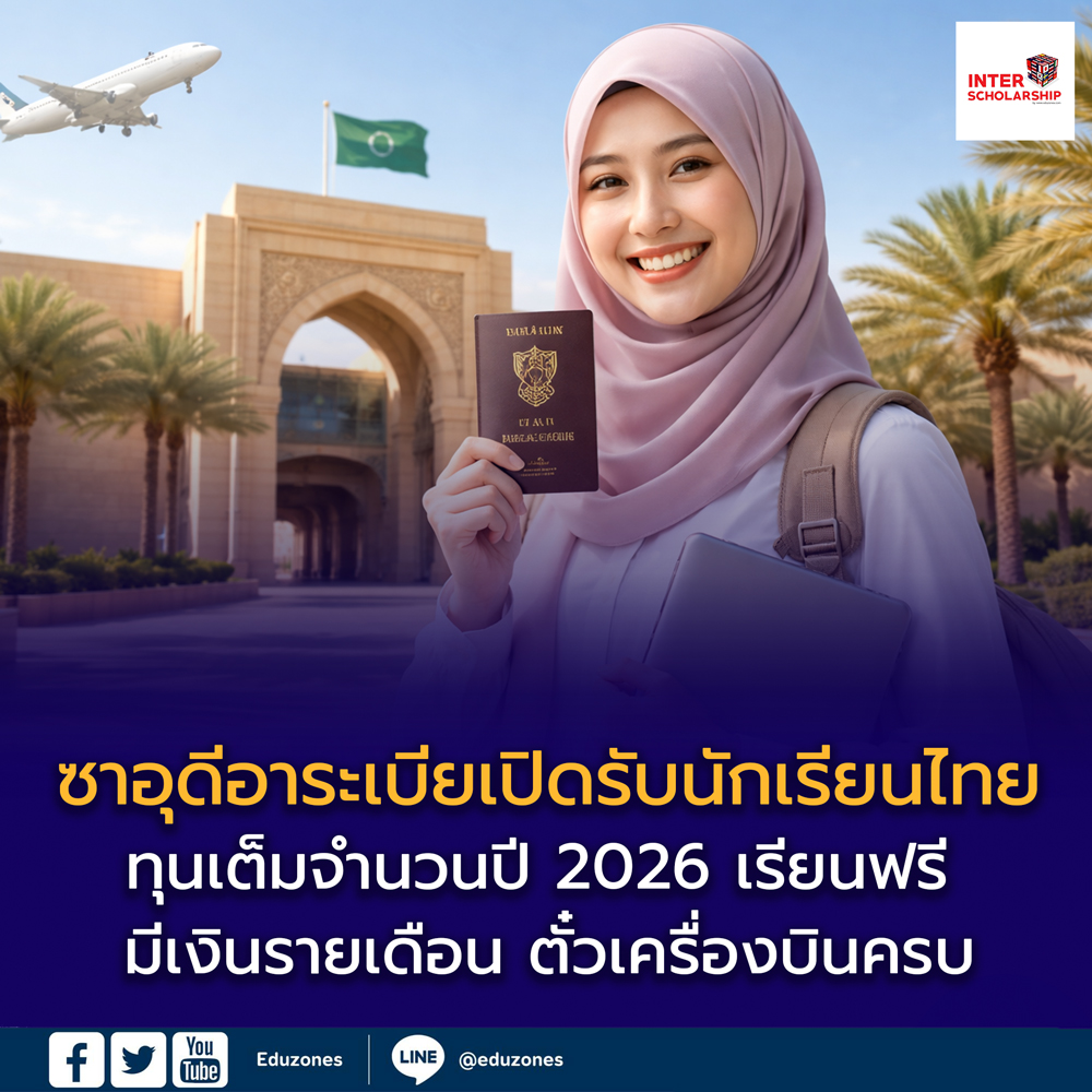 มหาวิทยาลัยกรุงเทพ จับมือ Omnicom Media Thailand ประกาศก้าวสู่ Creative Ecosystem ระดับสากล เปิดหลักสูตร Global Creator and Influencer Branding รับโลกคอนเทนต์ยุค AI tui sakrapeeApril 8, 2026 มหาวิทยาลัยกรุงเทพ ตอกย้ำการเป็นมหาวิทยาลัยสร้างสรรค์ (Creative University) ผนึกกำลังกับ Omnicom Media Thailand พันธมิตรเอเจนซี่สื่อชั้นนำระดับโลก ลงนามความร่วมมือ (MoU) ยกระดับระบบนิเวศการเรียนรู้สู่ระดับสากล พร้อมเปิดตัวหลักสูตรสุดล้ำ “Global Creator and Influencer Branding”… EZ WebmasterApril 8, 2026 ทาโร ผนึกความร่วมมือกับ สำนักหอสมุดกลาง มหาวิทยาลัยศรีนครินทรวิโรฒ (มศว)) สำนักหอสมุดกลาง มศว เดินหน้าสร้างสรรค์โลกแห่งการเรียนรู้ ยกระดับห้องเรียนยุคใหม่ในรูปแบบ Edutainment ภายใต้โครงการ “บอร์ดเกม นวัตกรรมเสริมทักษะ สอนสนุก สำหรับครูนิวเทรนด์” เปลี่ยนห้องเรียนให้ “สนุก คิดเป็น… เปิดบ้าน ‘DPU Open House 2026’ ชวน GEN Z ค้นหาตัวตน ปลุกศักยภาพเปลี่ยนอนาคต EZ WebmasterApril 8, 2026 อนาคตเริ่มที่นี่! มหาวิทยาลัยธุรกิจบัณฑิตย์ (DPU) เปิดบ้านรับ GEN Z ร่วมค้นหาศักยภาพ ‘ปลุกพลังความเป็นที่ 1 ในตัวคุณ’ ผ่านกิจกรรม ‘DPU Open House 2026’ พร้อมอัปเดตเทรนด์ใหม่ ‘หลักสูตร–ทักษะ’ เพื่อปลุกศักยภาพเปลี่ยนอนาคต… คณะบริหารธุรกิจ ม.หอการค้าไทย จัด “UTCC UBS Open House 2569” เปิดพื้นที่ค้นหา DNA เด็กบริหาร EZ WebmasterApril 8, 2026 คณะบริหารธุรกิจ มหาวิทยาลัยหอการค้าไทย จัดกิจกรรม “UTCC UBS Open House 2569” อย่างยิ่งใหญ่และอบอุ่น ภายใต้แนวคิด “ค้นหา DNA เด็กบริหาร” เปิดโอกาสให้นักเรียนระดับมัธยมศึกษาจากทั่วประเทศได้ร่วมค้นหาศักยภาพและอัตลักษณ์ของตนเอง พร้อมสัมผัสบรรยากาศการเรียนรู้จริงภายในรั้วมหาวิทยาลัย เมื่อเร็ว ๆ… Search for: Search EZ Webmaster April 9, 2026 EZ Webmaster April 9, 2026 ซาอุดีอาระเบียเปิดรับนักเรียนไทย! ทุนเต็มจำนวนปี 2026 เรียนฟรี มีเงินรายเดือน ตั๋วเครื่องบินครบ 🌍 ซาอุดีอาระเบียเปิดรับนักเรียนไทย! ทุนเต็มจำนวนปี 2026 เรียนฟรี มีเงินรายเดือน ตั๋วเครื่องบินครบ โดย กองบรรณาธิการ Eduzones | อัปเดต 2569 โอกาสเรียนต่อต่างประเทศแบบ “ทุนเต็มจำนวน” กลับมาอีกครั้ง เมื่อกระทรวงศึกษาธิการแห่งราชอาณาจักรซาอุดีอาระเบีย เปิดรับสมัครนักศึกษาต่างชาติผ่านแพลตฟอร์มกลาง “Study in Saudi (ادرس في السعودية)” อย่างเป็นทางการ โดยเปิดโอกาสให้นักเรียนจากทั่วโลก รวมถึงประเทศไทย สมัครเข้าศึกษาต่อในมหาวิทยาลัยชั้นนำของประเทศ ครอบคลุมทุกระดับ ตั้งแต่ อนุปริญญา ปริญญาตรี โท และเอก 🎓 ทุนเต็มจำนวน ครอบคลุมทุกค่าใช้จ่าย ผู้ได้รับทุนจะได้รับการสนับสนุนแบบครบวงจร ได้แก่ 🎓 ยกเว้นค่าเล่าเรียนตลอดหลักสูตร 💰 เบี้ยเลี้ยงรายเดือน ประมาณ 840 – 900 ริยาล 🎁 เงินช่วยเหลือแรกเข้า (เทียบเท่า 2 เดือน) 🏠 ที่พักในมหาวิทยาลัยฟรี ✈️ ตั๋วเครื่องบินไป-กลับ ปีละ 1 ค