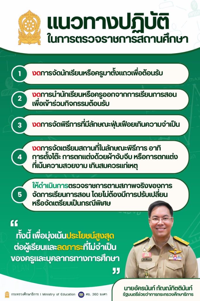 EZ Webmaster April 16, 2026 EZ Webmaster April 16, 2026 ศธ. ปรับแนวตรวจราชการใหม่ “ไม่ตั้งแถว-ไม่จัดฉาก” เน้นดูการเรียนจริง ลดภาระครู ศธ. ปรับแนวตรวจราชการใหม่ “ไม่ตั้งแถว-ไม่จัดฉาก” เน้นดูการเรียนจริง ลดภาระครู กระทรวงศึกษาธิการส่งสัญญาณปรับแนวทางการตรวจราชการสถานศึกษา หลัง อัครนันท์ กัณณ์กิตตินันท์ รัฐมนตรีช่วยว่าการกระทรวงศึกษาธิการ ประกาศ “แนวทางปฏิบัติใหม่” เพื่อให้การตรวจราชการมีประสิทธิภาพมากขึ้น และไม่กระทบต่อการจัดการเรียนการสอนในโรงเรียน แนวทางดังกล่าวมุ่งเน้นการลดพิธีการที่ไม่จำเป็น และให้ความสำคัญกับ “การเรียนรู้ของนักเรียน” เป็นศูนย์กลาง 🔎 5 แนวทางสำคัญในการตรวจราชการ ❌ ไม่ต้องจัดนักเรียนหรือครูมาตั้งแถวเพื่อต้อนรับ ❌ ไม่ต้องดึงนักเรียนหรือครูออกจากห้องเรียนเพื่อร่วมกิจกรรม ❌ ไม่ต้องจัดพิธีการที่ฟุ่มเฟือยเกินความจำเป็น ❌ ไม่ต้องจัดเตรียมสถานที่เชิงพิธี เช่น โต๊ะรับรอง หรือการตกแต่งเกินจำเป็น ✅ ตรวจราชการตาม “สภาพจริง” ของการจัดการเรียนการสอน 🎯 เปลี่ยนจาก “พิธีการ” สู่ “คุณภาพจริง” นโยบายนี้สะท้อนการเปลี่ยนแนวคิดของ กระทรวงศึกษาธิการ ที่ต้องการให้การตรวจราชการสะท้อนสภาพจริงของโรงเรียน มากกว่าการจัดฉากเพื่อการประเมิน ที่ผ่านมา โรงเรียนจำนวนไม่น้อยต้องใช้เวลาและทรัพยากรไปกับการเตรียมการต้อนรับ เช่น การซ้อมแถว การจัดสถานที่ หรือการจัดกิจกรรมพิเศษ ซึ่งอาจส่งผลกระทบต่อเวลาเรียนของนักเรียนโดยตรง 👩🏫 ลดภาระครู คืนเวลาให้นักเรียน หนึ่งในเป้าหมายหลักของมาตรการนี้ คือการลดภาระงานที่ไม่จำเป็นของครูและบุคลากรทางการศึกษา เพื่อให้สามารถโฟกัสกับการจัดการเรียนการสอนได้เต็มที่ ขณะเดียวกัน นักเรียนก็จะไม่ถูกดึงออกจากห้องเรียนเพื่อร่วมกิจกรรมต้อนรับ ส่งผลให้การเรียนรู้มีความต่อเนื่องและมีประสิทธิภาพมากขึ้น 📌 จุดเริ่มต้นของการเปลี่ยนวัฒนธรรมโรงเรียน แนวทาง “ไม่ตั้งแถว-ไม่จัดฉาก” ครั้งนี้ ถือเป็นอีกหนึ่งก้าวสำคัญของการปฏิรูปวัฒนธรรมในระบบการศึกษาไทย จากการเน้นภาพลักษณ์ภายนอก ไปสู่การให้ความสำคัญกับคุณภาพการเรียนรู้ที่แท้จริง หากสามารถขับเคลื่อนได้อย่างต่อเนื่อง ก็อาจช่วยสร้างมาตรฐานใหม่ของการบริหารจัดการศึกษา ที่เน้น “ผู้เรียนเป็นศูนย์กลาง” อย่างแท้จริง
