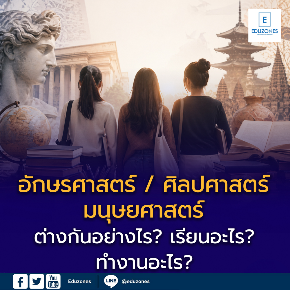 EZ Webmaster April 20, 2026 EZ Webmaster April 20, 2026 อักษรศาสตร์ / ศิลปศาสตร์ / มนุษยศาสตร์ ต่างกันอย่างไร? เรียนอะไร? ทำงานอะไร? อักษรศาสตร์ / ศิลปศาสตร์ / มนุษยศาสตร์ ต่างกันอย่างไร? เรียนอะไร? ทำงานอะไร? “อยากเรียนภาษา ควรเข้าคณะไหน?” คือคำถามที่น้องๆ ม.ปลายถามกันมากทุกปี เพราะทั้งสามคณะดูเหมือนจะเรียนเหมือนกัน แต่ในความเป็นจริงมีความแตกต่างทั้งในเชิงปรัชญา จุดเน้น และเส้นทางอาชีพ บทความนี้ Eduzones จะวิเคราะห์ให้ลึกกว่าการแค่ “บอกว่าต่างกัน” เพื่อให้น้องๆ เลือกได้ถูกคณะจริงๆ ความเข้าใจผิดที่พบบ่อย: แก้ก่อนอ่านต่อ ก่อนเข้าเนื้อหา ขอคลายความเข้าใจผิดที่พบบ่อยที่สุด 4 ข้อ “อักษรศาสตร์ = เรียนแค่ภาษา” → ไม่จริง อักษรศาสตร์ครอบคลุมวรรณคดี ปรัชญา อารยธรรม และการตีความเชิงวิพากษ์ที่ลึกกว่าการเรียนภาษาทั่วไปมาก “ศิลปศาสตร์ = เรียนศิลปะ” → ไม่จริง ศิลปศาสตร์ (Liberal Arts) หมายถึงการศึกษาแบบรอบด้าน ไม่ใช่วิจิตรศิลป์หรือทัศนศิลป์ “มนุษยศาสตร์ = จบไปเป็นครูอย่างเดียว” → ไม่จริง บัณฑิตมนุษยศาสตร์ทำงานในสาย HR สื่อ การทูต NGO วิชาการ และธุรกิจระหว่างประเทศได้หลากหลาย “ทั้งสามคณะเหมือนกันหมด” → ไม่จริงทั้งหมด แม้จะมีรากเดียวกัน แต่ปรัชญาและจุดเน้นต่างกันมีนัยสำคัญ โดยเฉพาะเมื่อเทียบระหว่างอักษรศาสตร์ (เชิงลึก) กับศิลปศาสตร์ (เชิงประยุกต์) 1. ภาพรวม: สามชื่อ สามปรัชญา แต่รากเดียวกัน ทั้งสามคณะล้วนอยู่ในกลุ่ม Humanities ซึ่งเป็นศาสตร์ที่ศึกษามนุษย์ผ่านภาษา วรรณกรรม ปรัชญา ประวัติศาสตร์ และวัฒนธรรม ตามนิยามของ Britannica Humanities คือสาขาวิชาที่เน้นการตีความ การวิเคราะห์เชิงวิพากษ์ และการสำรวจประสบการณ์มนุษย์ผ่านแหล่งข้อมูลปฐมภูมิ Humanities แตกต่างจาก Social Sciences ตรงที่โดยทั่วไปไม่ได้ใช้ระเบียบวิธีเชิงปริมาณเป็นแกนหลักเหมือนสังคมศาสตร์ แต่เน้นการตีความและการวิเคราะห์เชิงคุณภาพ ทั้งนี้บางสาขาในกลุ่ม Humanities เช่น ภาษาศาสตร์เชิงคอมพิวเตอร์หรือ Digital Humanities ก็ใช้ข้อมูลและระเบียบวิธีเชิงปริมาณอย่างเข้มข้นเช่นกัน ความแตกต่างในชื่อเกิดจาก แนวคิดในการก่อตั้งคณะที่ต่างกันของแต่ละมหาวิทยาลัย ไม่ใช่ความแตกต่างเชิงเนื้อหาทั้งหมด ในทางปฏิบัติ สาขาบางสาขาสามารถพบได้ในทั้งสามคณะขึ้นอยู่กับมหาวิทยาลัย 📌 หลักการจำง่าย: อักษรศาสตร์ = เน้นลึก (ภาษา+วรรณคดี+ปรัชญา) | มนุษยศาสตร์ = เน้นกว้าง (มนุษย์+สังคม+วัฒนธรรม) | ศิลปศาสตร์ = เน้นรอบด้าน (Liberal Arts บูรณาการหลายศาสตร์) 💡 สิ่งที่ต้องเข้าใจก่อน: ในหลายกรณี สาขาที่เลือกสำคัญกว่าชื่อคณะ เพราะบางสาขา เช่น ภาษาอังกฤษหรือภาษาญี่ปุ่น เปิดสอนในทั้งสามคณะพร้อมกัน ค