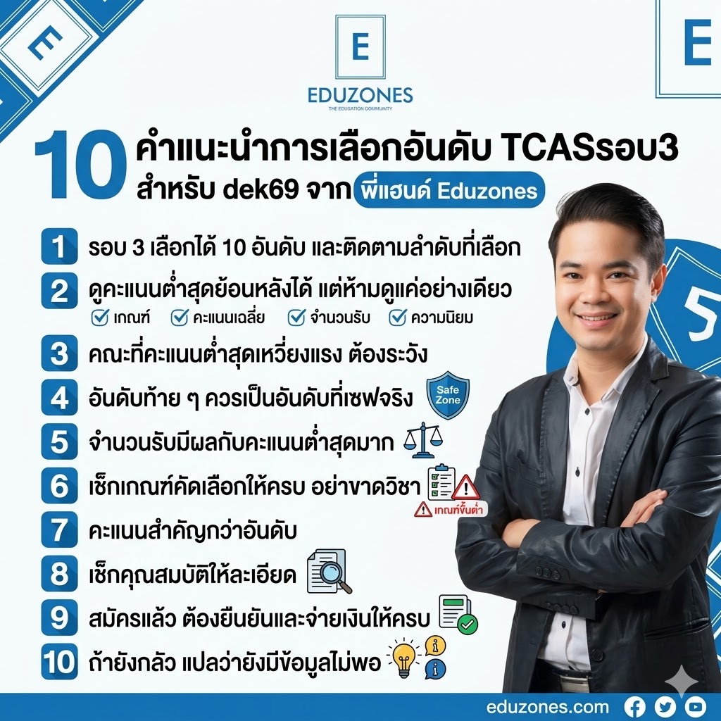 EZ Webmaster April 21, 2026 EZ Webmaster April 21, 2026 10 คำแนะนำการเลือกอันดับ TCASรอบ3 Admission สำหรับ dek69 และเด็กซิ่ว จากพี่แฮนด์ Eduzones 📌10 คำแนะนำการเลือกอันดับ TCASรอบ3 สำหรับ dek69 และเด็กซิ่ว จากพี่แฮนด์ Eduzones ช่วงเวลาการเลือกอันดับใน TCAS รอบ 3 (Admission) ถือเป็นอีกหนึ่งจุดสำคัญของการเข้ามหาวิทยาลัย เพราะระบบจะคัดเลือกให้ “ติดเพียง 1 อันดับเท่านั้น” และยึดตามลำดับที่ผู้สมัครเลือกไว้ ดังนั้น การวางแผนอันดับจึงมีผลอย่างมากต่อโอกาสในการสอบติด พี่แฮนด์ Eduzones สรุป 10 แนวทางสำคัญ เพื่อให้น้อง ๆ #dek69 และเด็กซิ่วใช้เป็นแนวทางในการตัดสินใจก่อนยื่นสมัครจริง 🎯 1. เลือกได้ 10 อันดับ และ “ติดตามลำดับที่เลือก” ระบบจะพิจารณาเรียงตามอันดับ ถ้าติดอันดับ 1 → อันดับอื่นจะถูกตัดทันที ถ้าไม่ติด → ระบบจะไล่พิจารณาอันดับถัดไป 📌 คณะที่อยากเรียนจริง ควรอยู่ “อันดับต้น ๆ” 👉 “เลือก = มีโอกาส / ไม่เลือก = โอกาสเป็นศูนย์” 📊 2. ดูคะแนนต่ำสุดย้อนหลัง แต่ต้องวิเคราะห์ร่วม คะแนนต่ำสุดในอดีตช่วยดูแนวโน้มได้ แต่ไม่ควรใช้เป็นตัวตัดสินเพียงอย่างเดียว ควรพิจารณาร่วมกับ เกณฑ์คัดเลือกของปีนั้น แนวโน้มคะแนนสอบแต่ละวิชา จำนวนรับ จำนวนผู้สมัคร ความนิยมของคณะ 📌 แนะนำให้ดูหลายปี และมองเป็น “กราฟแนวโน้ม” 📉 3. คณะที่คะแนนเหวี่ยงแรง ต้องระวัง ถ้าคะแนนขึ้นลงมากในแต่ละปี 👉 แสดงว่ามีความผันผวนสูง ปีที่แล้วคะแนนต่ำ ปีนี้อาจพุ่งขึ้นได้ 📌 ไม่ควรเอาไปไว้ “อันดับท้าย” หากคะแนนเราไม่ได้สูงกว่ามาก 🛡️ 4. อันดับท้ายต้อง “เซฟจริง” ตั้งแต่อันดับ 6 ลงไป ควรเป็นตัวเลือกที่ คะแนนเราสูงกว่าคะแนนต่ำสุดหลายปี หรือแนวโน้มคะแนนค่อนข้างนิ่ง 👉 เพื่อให้มี “โอกาสติดรองรับ” 📈 5. จำนวนรับมีผลต่อคะแนน ถ้าปีนี้ “รับน้อยลง” 👉 โอกาสที่คะแนนต่ำสุดจะสูงขึ้นมีมาก 📌 แม้คะแนนเราจะสูงกว่าปีก่อน ก็อย่าชะล่าใจ 📑 6. เช็กเกณฑ์คัดเลือกให้ครบ แต่ละมหาวิทยาลัยใช้เกณฑ์ต่างกัน ต้องมีคะแนน “ครบตามที่กำหนด” เช็ก “เกณฑ์ขั้นต่ำ” ของแต่ละวิชา 📌 ถ้าขาดวิชา = เสียโอกาสทันที 🏆 7. คะแนนสำคัญกว่าอันดับ การคัดเลือกพิจารณาจาก “คะแนน” เป็นหลัก 👉 แม้เลือกอันดับรอง แต่ถ้าคะแนนสูงกว่า ก็มีโอกาสติดก่อน 📌 อย่าเลือกอันดับ 1 แบบไม่อยากเรียนจริง 🧾 8. เช็กคุณสมบัติให้ละเอียด นอกจากคะแนน ต้องดู สายการเรียน เงื่อนไขเฉพาะ เอกสารที่ต้องใช้ 📌 รายละเอียดเล็ก ๆ อาจทำให้ “หลุดสิทธิ์” ได้ ⏰ 9. สมัครแล้ว ต้องยืนยัน + จ่ายเงิน การสมัครจะสมบูรณ์เมื่อ ✔️ ยืนยันข้อมูลครบ ✔️ ชำระเงินภายในเวลาที่กำหนด 📌 พลาดขั้นตอนนี้ = หมดสิทธิ์ทันที 🧠 10. ความกลัวเกิดจาก “ข้อมูลไม่พอ” ยิ่งมีข้อมูลมาก 👉 ยิ่งวา