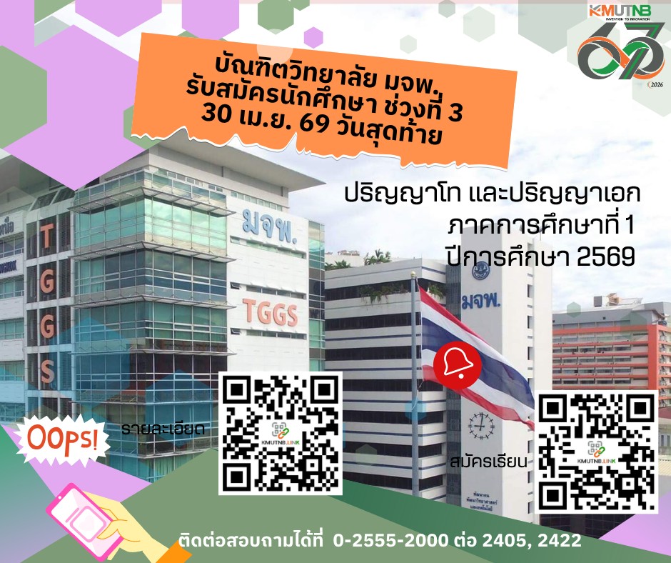 EZ Webmaster April 21, 2026 EZ Webmaster April 21, 2026 บัณฑิตวิทยาลัย มจพ. รับสมัครนักศึกษา ป.โท-เอก ช่วงที่ 3 วันสุดท้าย 30 เม.ย 69 นี้ บัณฑิตวิทยาลัย มหาวิทยาลัยเทคโนโลยีพระจอมเกล้าพระนครเหนือ (มจพ.) เปิดรับสมัครนักศึกษาใหม่ ในระดับปริญญาโท และปริญญาเอก ภาคการศึกษาที่ 1 ปีการศึกษา 2569 ช่วงที่ 3 รอบสุดท้ายแล้ว! ภาคปกติและภาคพิเศษ ทั้งหลักสูตรภาษาไทย ภาษาอังกฤษ และนานาชาติ ทั้ง มจพ. กรุงเทพฯ มจพ.วิทยาเขตระยอง และ มจพ. วิทยาเขตปราจีนบุรี สมัครได้ตั้งแต่ 4 กุมภาพันธ์ 2569 – 30 เมษายน 2569 ทั้ง 13 คณะ ได้แก่ 👉คณะวิศวกรรมศาสตร์ 👉คณะครุศาสตร์อุตสาหกรรม 👉 วิทยาลัยเทคโนโลยีอุตสาหกรรม 👉คณะวิทยาศาสตร์ประยุกต์ 👉คณะศิลปศาสตร์ประยุกต์ 👉คณะสถาปัตยกรรมและการออกแบบ 👉คณะอุตสาหกรรมเกษตรดิจิทัล 👉คณะเทคโนโลยีและการจัดการอุตสาหกรรม 👉คณะเทคโนโลยีสารสนเทศและนวัตกรรมดิจิทัล 👉คณะบริหารธุรกิจ 👉คณะวิทยาศาสตร์ พลังงานและสิ่งแวดล้อม 👉คณะพัฒนาธุรกิจและอุตสาหกรรม 👉คณะบริหารธุรกิจและอุตสาหกรรมบริการ 📚 รายละเอียดเพิ่มเติม https://kmutnb.link/BCk1nh 📍📍 สมัครออนไลน์ได้ที่ https://kmutnb.link/5Hshz5 สอบถามรายละเอียดได้ที่ บัณฑิตวิทยาลัย ชั้น 12 อาคารนวมินทรราชินี มหาวิทยาลัยเทคโนโลยีพระจอมเกล้าพระนครเหนือ(มจพ.) โทรศัพท์ 02555-2000 ต่อ 2405, 2422