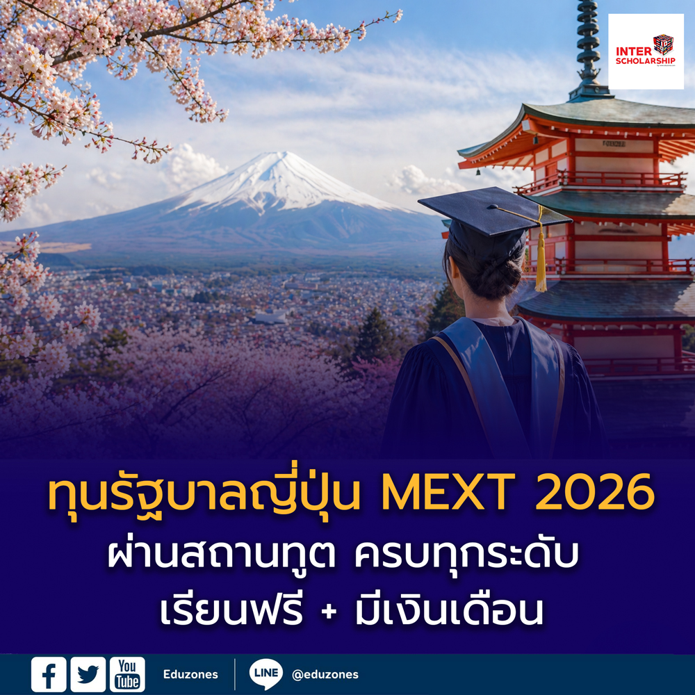 EZ Webmaster April 23, 2026 EZ Webmaster April 23, 2026 ทุนรัฐบาลญี่ปุ่น MEXT 2026 ผ่านสถานทูต ครบทุกระดับ เรียนฟรี + มีเงินเดือน 🇯🇵 เปิดสมัครแล้ว! ทุนรัฐบาลญี่ปุ่น MEXT 2026 ผ่านสถานทูต ครบทุกระดับ เรียนฟรี + มีเงินเดือน ข่าวดีสำหรับนักเรียนไทยที่วางแผนเรียนต่อประเทศญี่ปุ่น ล่าสุด กระทรวงศึกษาธิการ วัฒนธรรม กีฬา วิทยาศาสตร์ และเทคโนโลยีญี่ปุ่น (MEXT) เปิดรับสมัคร ทุนรัฐบาลญี่ปุ่น ประจำปี 2026 (รอบสถานทูต) อย่างเป็นทางการ ทุนนี้ถือเป็นหนึ่งในทุนยอดนิยมของนักเรียนไทย เนื่องจาก ครอบคลุมค่าใช้จ่ายทั้งหมด พร้อมเงินสนับสนุนรายเดือน และเปิดรับสมัครครบทุกระดับการศึกษา ตั้งแต่ปริญญาตรีจนถึงระดับบัณฑิตศึกษา 🌟 จุดเด่นของทุน MEXT 💸 เรียนฟรี 100% ครอบคลุมค่าเล่าเรียนทั้งหมด ✈️ มีตั๋วเครื่องบินไป–กลับ 💰 มีเงินเดือนรายเดือน สำหรับค่าครองชีพ 📚 มีคอร์สเรียนภาษาญี่ปุ่น ก่อนเข้าเรียนจริง 🧾 ไม่มีข้อผูกมัด หลังจบการศึกษา 🎯 ประเภททุนที่เปิดรับ 1️⃣ ปริญญาตรี (Undergraduate) ระยะเวลา: 5–7 ปี (รวมปรับพื้นฐาน) จำนวน: 12 ทุน คุณสมบัติ: อายุไม่เกิน 25 ปี GPAX ≥ 3.50 หรือ GPAX 3.30–3.49 พร้อมผลภาษา (JLPT/EJU) 📌 สอบ: ญี่ปุ่น + อังกฤษ + คณิต + วิทยาศาสตร์ (ตามสาย) 2️⃣ วิทยาลัยเทคโนโลยี (KOSEN) สาย: วิศวกรรม ระยะเวลา: 4–4.5 ปี จำนวน: 12 ทุน GPAX ≥ 3.00 📌 สอบ: ญี่ปุ่น + อังกฤษ + คณิต + วิทย์ 3️⃣ วิทยาลัยฝึกอาชีพ (Specialized Training) ระยะเวลา: 3 ปี จำนวน: 12 ทุน GPAX ≥ 3.00 📌 สอบ: ญี่ปุ่น + อังกฤษ + คณิต 4️⃣ นักศึกษาวิจัย (Research Students) ระยะเวลา: 1.5–2 ปี (ก่อนต่อโท/เอก) จำนวน: 32 ทุน คุณสมบัติ อายุไม่เกิน 35 ปี ป.ตรี GPAX ≥ 3.25 GPAX 3.00–3.24 ต้องมีคะแนนภาษา (JLPT/IELTS/TOEFL/TOEIC) 📌 สอบ: ญี่ปุ่น + อังกฤษ + วิชาเฉพาะ 📝 ขั้นตอนการสมัคร (สำคัญ) สมัครได้เพียง 1 ประเภททุนต่อปี ต้องสอบข้อเขียน (ภาษา + วิชาเฉพาะ) เลือกสนามสอบได้: กรุงเทพฯ / เชียงใหม่ / ขอนแก่น / สงขลา 📅 กำหนดการสำคัญ ⏳ เปิดรับสมัคร: ภายในเดือนเมษายน 2569 📢 สอบข้อเขียน–สัมภาษณ์: มิถุนายน – กรกฎาคม 2569 📤 เสนอชื่อไปญี่ปุ่น: สิงหาคม 2569 🎉 ประกาศผล: มกราคม 2570 ✈️ เดินทาง: เมษายน 2570 🔗 ดูรายละเอียดเพิ่มเติม 👉 https://www.th.emb-japan.go.jp/itpr_th/jis_study.html 📞 ติดต่อสอบถาม 📍 สถานเอกอัครราชทูตญี่ปุ่นประจำประเทศไทย ☎️ 02-207-8504 ต่อ 658 📧 japanese-scholarship@bg.mofa.go.jp 📍 สถานกงสุลใหญ่ญี่ปุ่น ณ เชียงใหม่ ☎️ 052-012-500 ต่อ 190 📌 สรุป ทุน MEXT 2026 เป็นโอกาสสำคัญสำหรับนักเรียนไทยที่ต้องการเรียนต่อญี่ปุ่นแบบครบวงจร ทั้งค่าเรียน ค่าครองชีพ และโอกาสในระดับนานาชาติ 👉 ผู้ที่สนใจควรเริ่มเตรียมตัวสอบตั้งแต่เนิ่น ๆ เนื่องจากการแข่งขันค่อนข้างสูง 📍 ติดตามข่าวทุนและการศึกษาต่อเพิ่มเติมได้ที่ Eduzones.com