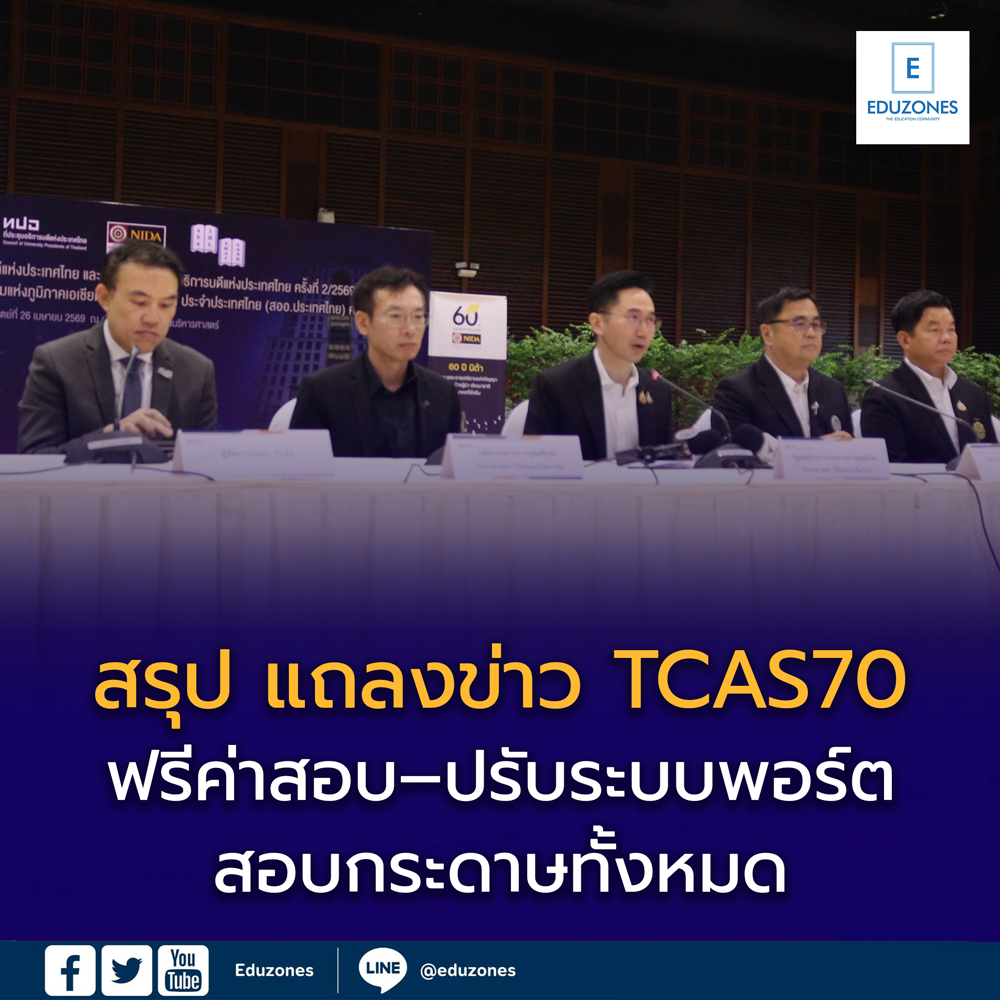 EZ Webmaster April 26, 2026 EZ Webmaster April 26, 2026 สรุปสิ่งต้องรู้ TCAS70 หลังแถลงข่าว 26 เม.ย. ฟรีค่าสอบ–ปรับระบบพอร์ต–สอบกระดาษทั้งหมด 📣 สรุปสิ่งต้องรู้ TCAS70 หลังแถลงข่าว 26 เม.ย. ฟรีค่าสอบ–ปรับระบบพอร์ต–สอบกระดาษทั้งหมด หลังการแถลงข่าวระบบการคัดเลือกบุคคลเข้าศึกษาต่อในระดับอุดมศึกษา TCAS70 เมื่อวันที่ 26 เมษายน 2569 มีหลายประเด็นสำคัญที่นักเรียนรุ่น #dek70 ต้องรู้ เพื่อวางแผนเตรียมตัวล่วงหน้า 📌 1. โครงสร้างรอบสมัคร (เหมือนเดิม) TCAS70 ยังคงมี 4 รอบ ได้แก่ รอบที่ 1: Portfolio รอบที่ 2: Quota รอบที่ 3: Admission รอบที่ 4: Direct Admission 📅 2. วันเปิดระบบ TCAS70 ระบบลงทะเบียน TCAS70 เปิด: 15 กรกฎาคม 2569 👉 น้อง ๆ สามารถเริ่มวางแผนการสมัครได้ตั้งแต่ช่วงนี้ 📝 3. รูปแบบการสอบ ปีนี้ใช้รูปแบบเดียวคือ 👉 สอบกระดาษ (Paper-Based Test: PBT) ครอบคลุมทั้ง TGAT / TPAT A-Level 💙 4. TCAS เท่าเทียม ลดค่าใช้จ่าย มาตรการสำคัญเพื่อช่วยผู้สมัคร ✔️ ฟรีสอบ TGAT / TPAT 1–5 ✔️ ฟรีสอบ A-Level สูงสุด 7 วิชา ✔️ ฟรีสมัครรอบ 3 สูงสุด 7 อันดับ ✔️ ลดค่าสมัคร Portfolio 25% (นักเรียน กสศ.) 📂 5. ระบบ TCASfolio (Portfolio ที่เป็นธรรม) TCAS70 เน้น “คุณภาพมากกว่าปริมาณ” 📌 ใช้มาตรฐานกลาง TCASfolio 📌 มีระบบ TCAS Verified รับรองผลงาน 📌 ลดการจ้างทำพอร์ต 📌 เน้นสะท้อนศักยภาพจริง ลดความเหลื่อมล้ำ ⚠️ 6. สมัครสอบล่าช้า + รับเพิ่มรอบ 3 ปีนี้มีความยืดหยุ่นมากขึ้น ยื่นคำร้องสมัครสอบล่าช้าได้ (ภายใน 2 วันหลังปิดสมัครสอบ) เปิดรับสมัครเพิ่มเติมในรอบ 3 (หลังปิดสมัคร 2 วัน) 📌 อาจไม่ได้รับสิทธิ์สนับสนุนค่าสมัคร 🎯 7. เริ่มวางแผนได้ตั้งแต่ตอนนี้ เริ่มจาก “รู้ตัวเองอยากไปทางไหน” ศึกษาระเบียบการปีที่ผ่านมา รอเกณฑ์รอบ Portfolio (เริ่มประกาศช่วง ก.ค.) 👉 ยิ่งเริ่มเร็ว ยิ่งได้เปรียบ 🔍 8. การขอทบทวนผลสอบ ยังคงมีเหมือนเดิม ค่าธรรมเนียม: 100 บาท/วิชา สูงสุด: 300 บาท 💸 9. ตรึงค่าสมัครสอบ แม้มีแผนจะขึ้นราคา แต่ปีนี้ยังใช้ราคาเดิม 👉 และ “สอบฟรี” ตามเงื่อนไขที่กำหนด 📅 10. ปรับปฏิทินสอบ–สมัคร รอบ Portfolio เริ่มเร็วขึ้น: 15 ส.ค. เป็นต้นไป ไม่มีมหาวิทยาลัยเปิดก่อนวันดังกล่าว TGAT / TPAT ปรับไปสอบช่วง มกราคม 📌 เพื่อลดผลกระทบจากปัญหาในปีที่ผ่านมา เช่น น้ำท่วม 📌 สรุป TCAS70 เป็นอีกปีที่มีการปรับระบบหลายด้าน 👉 ลดค่าใช้จ่าย 👉 เพิ่มความเป็นธรรม 👉 ปรับระบบสอบและ Portfolio ให้ชัดเจนขึ้น 📍 สำหรับ #dek70 ควรเริ่มวางแผนตั้งแต่ตอนนี้ เพื่อให้พร้อมที่สุดก่อนเข้าสู่สนามจริง 📍 ติดตามข่าว TCAS และแนะแนวการศึกษาต่อเพิ่มเติมได้ที่ Eduzones.com