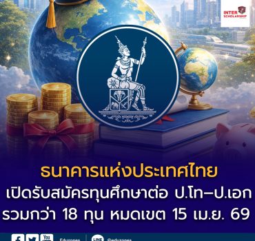 ธนาคารแห่งประเทศไทย เปิดรับสมัครทุนศึกษาต่อ ป.โท–ป.เอก ปี 2569 รวมกว่า 18 ทุน ครอบคลุมสายการเงิน เทคโนโลยี และกฎหมาย สมัครถึง 15 เมษายน 2569 ธนาคารแห่งประเทศไทย…