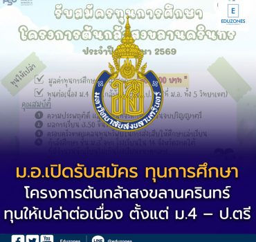 🌱 เปิดรับสมัครแล้ว! ทุนการศึกษา “โครงการต้นกล้าสงขลานครินทร์” ปีการศึกษา 2569 (รุ่นที่ 22) EZ WebmasterDecember 14, 2025 🌱 เปิดรับสมัครแล้ว! ทุนการศึกษา “โครงการต้นกล้าสงขลานครินทร์” ปีการศึกษา 2569 (รุ่นที่ 22) โอกาสสำคัญสำหรับน้อง ๆ ม.3 ในพื้นที่ภาคใต้ ที่มีความตั้งใจเรียนและขาดแคลนทุนทรัพย์มหาวิทยาลัยสงขลานครินทร์ (ม.อ.) เปิดรับสมัคร ทุนการศึกษาโครงการต้นกล้าสงขลานครินทร์ ประจำปีการศึกษา 2569… เปิดรับสมัครแล้ว! โครงการฝึกงาน U.S. Mission Thailand 2026 สำหรับนักศึกษา EZ WebmasterDecember 14, 2025 🇺🇸✨ เปิดรับสมัครแล้ว! โครงการฝึกงาน U.S. Mission Thailand 2026 สำหรับนักศึกษา อีกหนึ่งโอกาสสำคัญสำหรับนักศึกษาที่อยากเก็บประสบการณ์ทำงานระดับนานาชาติ!U.S. Mission Thailand เปิดรับสมัคร Foreign National Student Intern Program ประจำปี…