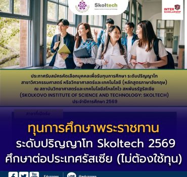 Blogทุนดีดีนักศึกษา ทุนการศึกษาพระราชทาน ระดับปริญญาโท Skoltech ปีการศึกษา 2569 EZ Webmaster December 14, 2025 📣 เปิดรับสมัครแล้ว! ทุนการศึกษาพระราชทาน ระดับปริญญาโท Skoltech ปีการศึกษา 2569 ศึกษาต่อประเทศรัสเซีย (ไม่มีข้อผูกพันการใช้ทุน) อีกหนึ่งโอกาสสำคัญสำหรับผู้ที่สนใจศึกษาต่อระดับ ปริญญาโทด้านวิทยาศาสตร์และวิศวกรรมศาสตร์ ในสถาบันการศึกษาชั้นนำระดับนานาชาติสถาบันวิทยาศาสตร์และเทคโนโลยีสโกลโกโว (Skolkovo Institute of Science…