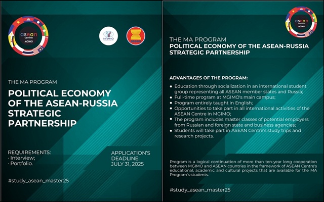 InterScholarship ข่าวทุนการศึกษา เรียนต่อต่างประเทศ May 9, 2025 ทุน ASEAN-Russia InterScholarship ข่าวทุนการศึกษา เรียนต่อต่างประเทศ May 9, 2025 ASEAN Centre at MGIMO ร่วมกับมหาวิทยาลัย MGIMO ประเทศรัสเซีย เปิดรับสมัครนักศึกษาเข้าศึกษาในระดับปริญญาโท รุ่นที่ 3 ในหลักสูตร Political Economy of the ASEAN-Russia Strategic Partnership เปิดรับใบสมัครถึง 31 กรกฎาคม 2025 เป็นหลักสูตรการศึกษาความสัมพันธ์ระหว่างอาเซียนกับรัสเซีย การบูรณาการระดับภูมิภาค เศรษฐศาสตร์ระหว่างประเทศ และแนวโน้มเศรษฐกิจโลก โดยหลักสูตรนี้ได้รับการออกแบบมาเพื่อเสริมสร้างทักษะการวิเคราะห์และทักษะวิชาชีพให้กับผู้เรียน เพื่อเตรียมความพร้อมสำหรับการประกอบอาชีพในภาครัฐ องค์การระหว่างประเทศ ภาคธุรกิจ และภาคการวิจัย โดยผู้เรียนจะได้รับโอกาสฝึกประสบการณ์วิชาชีพกับสถาบันการศึกษาและวิจัยชั้นนำของรัสเซียรวมถึงองค์การระหว่างประเทศ โดยผู้สนใจสามารถสมัครและติดตามรายละเอียดเพิ่มเติมได้ทางเว็บไซต์ study-asean.mgimo.ru… Continue Reading