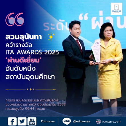 tui sakrapee August 16, 2025 สวนสุนันทา คว้ารางวัล ITA AWARDS 2025 “ผ่านดีเยี่ยม” อันดับหนึ่งสถาบันอุดมศึกษา tui sakrapee August 16, 2025 มหาวิทยาลัยราชภัฏสวนสุนันทา คว้ารางวัล ITA AWARDS 2025 จากผลการประเมินคุณธรรมและความโปร่งใสของหน่วยงานภาครัฐ (Integrity and Transparency Assessment: ITA) ประจำปีงบประมาณ 2568 ด้วยคะแนนสูงถึง 99.44 คะแนน อยู่ในระดับ “ผ่านดีเยี่ยม” ครองตำแหน่ง อันดับหนึ่งของกลุ่มสถาบันอุดมศึกษา ตอกย้ำบทบาทมหาวิทยาลัยที่บริหารจัดการด้วยธรรมาภิบาลอย่างแท้จริง พิธีประกาศผลและมอบรางวัลจัดขึ้นเมื่อวันที่ 15 สิงหาคม 2568 ณ ห้องนนทบุรี 2 สำนักงาน ป.ป.ช. (สนามบินน้ำ) ภายใต้แนวคิด… Continue Reading