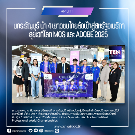 tui sakrapee July 24, 2025 มทร.ธัญบุรี นำ 4 เยาวชนไทยลัดฟ้าสู่สหรัฐอเมริกา ลุยเวทีโลก MOS และ Adobe 2025 tui sakrapee July 24, 2025 รศ.ดร.สมหมาย ผิวสอาด อธิการบดี มทร.ธัญบุรี พร้อมด้วยผู้บริหารสำนักวิทยบริการฯ และบริษัท เออาร์ไอที จำกัด ส่ง 4 ตัวแทนนักศึกษาไทย เข้าร่วมการแข่งขันทักษะคอมพิวเตอร์ระดับโลกที่สหรัฐฯ ในรายการ The 2025 Microsoft Office Specialist และ Adobe Certified Professional World Championships มหาวิทยาลัยเทคโนโลยีราชมงคลธัญบุรี (มทร.ธัญบุรี) โดยการนำของ รศ.ดร.สมหมาย ผิวสอาด อธิการบดี พร้อมด้วย รศ.ดร.อำนวย… Continue Reading