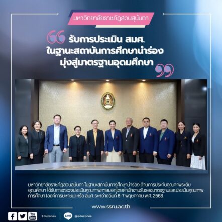 tui sakrapee May 8, 2025 สวนสุนันทา รับการประเมิน สมศ. ในฐานะสถาบันการศึกษานำร่อง มุ่งสู่มาตรฐานอุดมศึกษา tui sakrapee May 8, 2025 มหาวิทยาลัยราชภัฏสวนสุนันทา ในฐานะสถาบันการศึกษานำร่อง ด้านการประกันคุณภาพระดับอุดมศึกษา ได้รับการตรวจประเมินคุณภาพภายนอกโดยสำนักงานรับรองมาตรฐานและประเมินคุณภาพการศึกษา (องค์การมหาชน) หรือ สมศ. ระหว่างวันที่ 6–7 พฤษภาคม พ.ศ. 2568 ณ ห้องประชุมสภามหาวิทยาลัย ชั้น 5 อาคาร 31 ในการนี้ รองศาสตราจารย์ ดร.ชุติกาญจน์ ศรีวิบูลย์ อธิการบดีมหาวิทยาลัยราชภัฏสวนสุนันทา ให้เกียรติเป็นประธานกล่าวรายงานผลการดำเนินงานตามเกณฑ์มาตรฐานคุณภาพระดับอุดมศึกษา ประจำปีงบประมาณ พ.ศ. 2568 โดยมีคณะผู้บริหารเข้าร่วมรับการประเมินอย่างพร้อมเพรียง การประเมินครั้งนี้จัดขึ้นเพื่อสะท้อนความพร้อมของมหาวิทยาลัยราชภัฏสวนสุนันทาในการเป็น ต้นแบบสถาบันอุดมศึกษาที่มุ่งสู่ความเป็นเลิศอย่างยั่งยืน และเพื่อสร้างความเชื่อมั่นแก่หน่วยงานกำกับดูแลและสาธารณชน คณะกรรมการตรวจประเมินคุณภาพภายนอก… Continue Reading