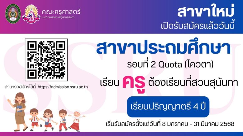 tui sakrapee January 14, 2025 ครุศาสตร์ สวนสุนันทา เปิดรับสมัครหลักสูตรใหม่ “สาขาประถมศึกษา” ทันสมัย เรียนรู้ครบทุกมิติ tui sakrapee January 14, 2025 ข่าวดี! เปิดรับสมัครหลักสูตรใหม่ สาขาประถมศึกษา มหาวิทยาลัยราชภัฏสวนสุนันทา 📣 โอกาสสำหรับคนที่อยากเป็นครูในอนาคตมาถึงแล้ว! คณะครุศาสตร์ มหาวิทยาลัยราชภัฏสวนสุนันทา เปิดรับสมัครนักศึกษาสาขาวิชาประถมศึกษา ระดับปริญญาตรี (4 ปี) ภาคปกติ สำหรับปีการศึกษา 2568 🎓 เหตุผลที่คุณไม่ควรพลาดหลักสูตรนี้ 🌟 หลักสูตรทันสมัย ออกแบบมาเพื่อพัฒนาทักษะครูที่ตอบโจทย์ยุคใหม่ 🌟 เรียนรู้ครบทุกมิติ ทั้งภาคทฤษฎีและปฏิบัติ เตรียมความพร้อมสู่อาชีพครูประถมศึกษาอย่างมั่นใจ 🌟 ทีมคณาจารย์คุณภาพ และสิ่งอำนวยความสะดวกครบครัน สมัครง่าย ๆ ได้ที่: 👉 สมัคร… Continue Reading