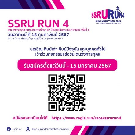 tui sakrapee December 4, 2023 สวนสุนันทา ชวนเดิน-วิ่งการกุศล สมทบทุนการศึกษา 87 ปี สวนสุนันทา มินิมาราธอน ครั้งที่ 4 tui sakrapee December 4, 2023 กองพัฒนานักศึกษา มหาวิทยาลัยราชภัฏสวนสุนันทา ขอเชิญชวนร่วมเดิน-วิ่งการกุศล สมทบทุนการศึกษา 87 ปี สวนสุนันทา มินิมาราธอน ครั้งที่ 4″ SSRU RUN 4 ในวันอาทิตย์ที่ 18 กุมภาพันธ์ 2567 ณ มหาวิทยาลัยราชภัฏสวนสุนันทา กรุงเทพมหานคร ด้วยระยะทาง 10.5 กิโลเมตร และระยะทาง 5 กิโลเมตร ข้ามผ่านสะพานกรุงธน ชมบรรยากาศยามเช้าสองฟากฝั่งแม่น้ำเจ้าพระยา เปิดรับสมัครแล้ว ตั้งแต่บัดนี้จนถึงวันที่ 15 มกราคม… Continue Reading