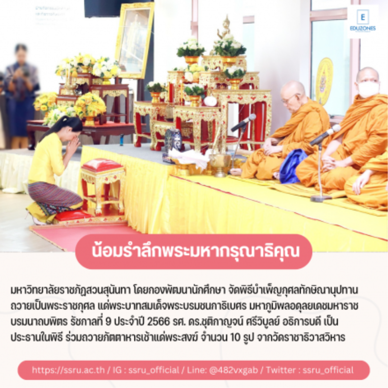 tui sakrapee December 4, 2023 สวนสุนันทา น้อมรำลึกพระมหากรุณาธิคุณ เนื่องในวันคล้ายวันพระบรมราชสมภพ ในหลวงรัชกาลที่ 9 tui sakrapee December 4, 2023 สวนสุนันทา จัดกิจกรรมน้อมรำลึกพระมหากรุณาธิคุณ เนื่องในวันคล้ายวันพระบรมราชสมภพ ในหลวงรัชกาลที่ 9 มหาวิทยาลัยราชภัฏสวนสุนันทา โดยกองพัฒนานักศึกษา จัดพิธีบำเพ็ญกุศลทักษิณานุปทาน ถวายเป็นพระราชกุศล แด่พระบาทสมเด็จพระบรมชนกาธิเบศร มหาภูมิพลอดุลยเดชมหาราช บรมนาถบพิตร รัชกาลที่ 9 ประจำปี 2566 รองศาสตราจารย์ ดร.ชุติกาญจน์ ศรีวิบูลย์ อธิการบดี เป็นประธานในพิธีร่วม ถวายภัตตาหารเช้าแด่พระสงฆ์ จำนวน 10 รูป จากวัดราชาธิวาสวิหาร จากนั้น เป็นกิจกรรมตักบาตรข้าวสารอาหารแห้ง ณ บริเวณอาคารศูนย์สุขภาพและกีฬา มีผู้บริหาร บุคลากรทุกฝ่าย… Continue Reading