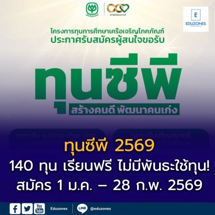 EZ Webmaster November 27, 2025 เครือเจริญโภคภัณฑ์ (CP) เปิดรับสมัครทุนการศึกษา ปี 2569 EZ Webmaster November 27, 2025 เครือเจริญโภคภัณฑ์ (ซีพี) เปิดรับสมัครทุนการศึกษา ปี 2569 รวม 140 ทุน เรียนฟรี ไม่มีพันธะใช้ทุน สนับสนุนเยาวชนไทยต่อยอดสู่อนาคต เครือเจริญโภคภัณฑ์ (CP Group) ประกาศเปิดรับสมัคร ทุนการศึกษา ปีการศึกษา 2569 เพื่อมอบโอกาสทางการศึกษาแก่เยาวชนไทยที่มีความสามารถ ขยันตั้งใจเรียน และมีความประพฤติดี แต่ขาดโอกาสทางการเงิน โดยปีนี้เปิดรับจำนวน รวม 140 ทุน ครอบคลุมหลายระดับการศึกษา ตั้งแต่มัธยมปลายจนถึงปริญญาตรี 🎓 ประเภททุนที่เปิดรับสมัคร ระดับการศึกษา จำนวนทุน… Continue Reading
