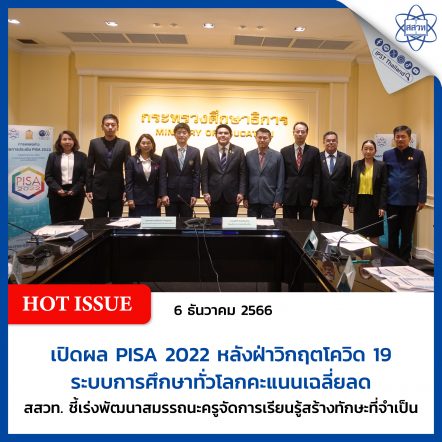 EZ Webmaster December 6, 2023 เปิดผล PISA 2022 หลังฝ่าวิกฤตโควิด 19 ระบบการศึกษาทั่วโลกคะแนนเฉลี่ยลด สสวท. ชี้เร่งพัฒนาสมรรถนะครูจัดการเรียนรู้สร้างทักษะที่จำเป็น EZ Webmaster December 6, 2023 วันที่ 6 ธันวาคม 2566 ณ ห้องประชุมจันทรเกษม ชั้น 1 อาคารราชวัลลภ กระทรวงศึกษาธิการ นายสุรศักดิ์ พันธ์เจริญวรกุล รัฐมนตรีช่วยว่าการกระทรวงศึกษาธิการ เป็นประธานการแถลงข่าวผลการประเมิน PISA 2022 พร้อมด้วย รองศาสตราจารย์ ธีระเดช เจียรสุขสกุล ผู้อำนวยการสถาบันส่งเสริมการสอนวิทยาศาสตร์และเทคโนโลยี (สสวท.) แถลงข่าวผลการประเมิน PISA 2022 โปรแกรมประเมินสมรรถนะนักเรียนมาตรฐานสากล หรือ PISA (Programme for International Student Assessment) ริเริ่มโดยองค์การเพื่อความร่วมมือทางเศรษฐกิจและการพัฒนา หรือ OECD (Organisation for Economic Co-operation and… Continue Reading