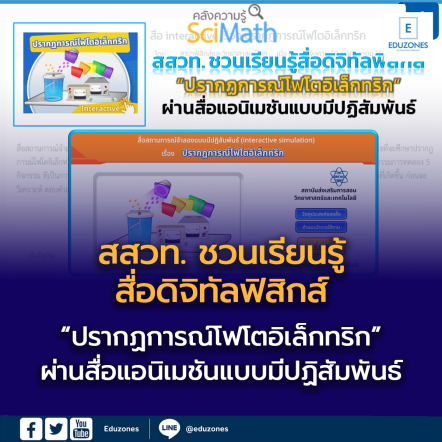 EZ Webmaster October 14, 2025 สสวท. ชวนเรียนรู้สื่อดิจิทัลฟิสิกส์ “ปรากฏการณ์โฟโตอิเล็กทริก” ผ่านสื่อแอนิเมชันแบบมีปฏิสัมพันธ์ EZ Webmaster October 14, 2025 สสวท. ชวนเรียนรู้สื่อดิจิทัลฟิสิกส์ “ปรากฏการณ์โฟโตอิเล็กทริก” ผ่านสื่อแอนิเมชันแบบมีปฏิสัมพันธ์ สถาบันส่งเสริมการสอนวิทยาศาสตร์และเทคโนโลยี (สสวท.) เชิญชวนครู นักเรียน และผู้สนใจร่วมเปิดประสบการณ์การเรียนรู้ “ปรากฏการณ์โฟโตอิเล็กทริก” ผ่านสื่อแอนิเมชันแบบมีปฏิสัมพันธ์ (interactive simulation) บนเว็บไซต์คลังความรู้ SciMath สสวท. แอนิเมชันนี้ออกแบบมาเพื่อจำลองการทดลองจริง ครอบคลุมกิจกรรมการทดลอง 5 กิจกรรม ที่เปิดโอกาสให้ผู้เรียนปรับเปลี่ยนตัวแปรได้ด้วยตนเอง แล้วสังเกตผลลัพธ์ที่เกิดขึ้น พร้อมทั้งตอบคำถาม วิเคราะห์ และสรุปผลอย่างเป็นระบบ โฟโตอิเล็กทริก เป็นปรากฏการณ์ที่อิเล็กตรอนหลุดออกจากผิวโลหะ เมื่อถูกกระทบด้วยแสงที่มีความถี่สูงเพียงพอ ถือเป็นหัวใจสำคัญในการทำความเข้าใจธรรมชาติของแสงและอิเล็กตรอน สื่อการเรียนรู้นี้จึงเป็นอีกเครื่องมือที่จะช่วยให้นักเรียนเข้าใจแนวคิดได้อย่างลึกซึ้งและสนุกไปกับการทดลองเสมือนจริง คลิกเพื่อเรียนรู้และทดลองด้วยตัวเองได้ที่ https://www.scimath.org/desktop-application/item/13183-interactive-6 Continue Reading