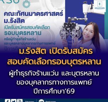 Blogนักศึกษานักเรียนมหาวิทยาลัย คณะทัศนมาตรศาสตร์ ม.รังสิต เปิดรับสมัครสอบคัดเลือก รอบบุตรหลาน หรือผู้ทำธุรกิจร้านแว่น และบุตรหลานของบุคลากรทางการแพทย์ ปีการศึกษา’69 คณะทัศนมาตรศาสตร์ มหาวิทยาลัยรังสิต เปิดรับสมัครสอบคัดเลือกบุคคลเข้าศึกษาต่อในระดับปริญญาตรี หลักสูตรทัศนมาตรศาสตรบัณฑิต รอบบุตรหลานหรือผู้ทำธุรกิจร้านแว่น และบุตรหลานของบุคลากรทางการแพทย์ ประจำปีการศึกษา 2569 โดยมีคุณสมบัติเฉพาะดังนี้ 1. รับสมัคร ผู้สำเร็จการศึกษาระดับมัธยมปลาย สายวิทย์-คณิต…