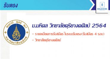 #รับตรง64 ม.มหิดล วิทยาลัยดุริยางคศิลป์ (เปิดรับสมัคร 4 ครั้ง) ถึง 18 มี.ค. 64 EZ Webmaster August 17, 2020 วิทยาลัยดุริยางคศิลป์ มหาวิทยาลัยมหิดล เปิดรับสมัครนักศึกษาระดับปริญญาตรี รอบรับตรง ปีการศึกษา 2564 เปิดรับสมัครด้วยกัน 4 ครั้ง ตั้งแต่วันที่ 31 กรกฎาคม 2563 – 18 มีนาคม 2564 สาขาที่เปิดรับสมัคร -สาขาวิชาปฏิบัติดนตรีคลาสสิก -สาขาวิชาดนตรีไทยและดนตรีตะวันออก -สาขาวิชาดนตรีแจ๊ส -สาขาวิชาดนตรีสมัยนิยม -สาขาวิชาละครเพลง -สาขาวิชาการประพันธ์ดนตรี -สาขาวิชานตรีศึกษาและการสอน -สาขาวิชาธุรกิจดนตรี -สาขาวิชาเทคโนโลยีดนตรี กำหนดการ -เปิดรับสมัครตั้งแต่วันที่ 31 กรกฎาคม 2563 – 18 มีนาคม 2564 -เปิดรับสมัคร 4 ครั้ง… Continue Reading