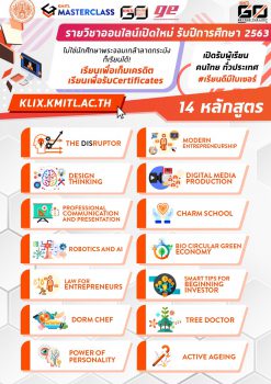 สจล. ชวนเรียน 14 คลาสออนไลน์ EZ Webmaster July 16, 2020 สถาบันเทคโนโลยีพระจอมเกล้าเจ้าคุณทหารลาดกระบัง (สจล.) เชิญชวนสมัครเรียนคลาสออนไลน์ 14 วิชาในหมวดศึกษาทั่วไป (General Education) อาทิ วิชาผู้ประกอบการสมัยใหม่ วิชาการสื่อสารและการเสนออย่างมืออาชีพ วิชากระบวนการคิดเชิงออกแบบ เป็นต้น โดยสำหรับผู้เรียนทั่วไป เมื่อสำเร็จหลักสูตร และผ่านเกณฑ์การวัดผลจะได้รับใบประกาศนียบัตร และสำหรับนักเรียนมัธยมปลาย สามารถเรียนเพื่อเก็บเครดิต (Credit Banking) เพื่อเตรียมเข้ามหาวิทยาลัยได้ โดยทั้ง 14 หลักสูตรเปิดรับสมัครแล้วตั้งแต่วันนี้เป็นต้นไป และเตรียมเปิดเรียนในเดือนสิงหาคม 2563 สำหรับผู้ที่สนใจสามารถดูรายละเอียดเพิ่มเติมได้และสมัครเรียนได้ที่ http://Klix.kmitl.ac.th Continue Reading