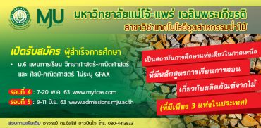 เทคโนโลยีอุตสาหกรรมป่าไม้ ม.แม่โจ้-แพร่ เฉลิมพระเกียรติ (แห่งเดียวในภาคเหนือ) เปิดรับสมัครนศ.ใหม่ ประจำปี 2563 EZ Webmaster May 20, 2020 สาขาวิชาเทคโนโลยีอุตสาหกรรมป่าไม้ : มหาวิทยาลัยแม่โจ้-แพร่ เฉลิมพระเกียรติ (แห่งเดียวในภาคเหนือ) เปิดรับสมัครบุคคลเข้าศึกษาต่อระดับปริญญาตรี ปีการศึกษา 2563 TCAS รอบที่ 4 Admission **ยกเว้น : ค่าธรรมเนียมหอพัก 1 ปี หลักสูตร 4 ปี •รับผู้สำเร็จ ม.6 วิทย์-คณิต / ศิลป์-คำนวณ ไม่ระบุ GPAX •สมัคร 7-20 พฤษภาคม 2563 •ระบบสมัคร www.Mytcas.com •ศึกษารายละเอียด ประกาศรับสมัคร/คุณสมบัติ องค์ประกอบ และ(ไม่มี)เกณฑ์ขั้นต่ำได้ที่ http://www.admissions.mju.ac.th/admin/fileloads/tcas4.pdf แนวทางประกอบอาชีพ ➢ นักวิจัยหรือพนักงานที่เกี่ยวกับโรงงานอุตสาหกรรมป่าไม้ ➢… Continue Reading