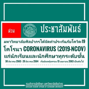 ม.ศิลปากรทำประกันภัยโควิด-19 ให้นักศึกษา-นักเรียนโรงเรียนสาธิตฯ ทุกคน tui sakrapee April 1, 2020 จากสถานการณ์การแพร่ระบาดของเชื้อไวรัสโคโรนา (โควิด-19) ที่เกิดการระบาด รุนแรงในวงกว้างขึ้นและมีแนวโน้มรุนแรงขึ้นเรื่อยๆ ผู้ช่วยศาสตราจารย์ชัยชาญ ถาวรเวช อธิการบดีมหาวิทยาลัยศิลปากร และผู้บริหารมหาวิทยาลัยศิลปากร ได้มีความห่วงใยและตระหนักถึงความปลอดภัยของนักเรียนและนักศึกษา มหาวิทยาลัยศิลปากรจึงได้จัดทำกรมธรรม์คุ้มครองการติดเชื้อไวรัสโคโรนา Coronavirus (2019-nCov) กลุ่ม ของบริษัท ทิพยประกันภัย จำกัด (มหาชน) เพื่อให้ความคุ้มครองแก่นักเรียนและนักศึกษาทุกระดับชั้น (ระดับปฐมวัย ประถมศึกษา มัธยมศึกษา และปริญญาตรี-เอก) โดยมีระยะเวลาเอาประกันภัยตั้งแต่วันที่ 30 มีนาคม 2563 – 29 มีนาคม 2564 และมีผลคุ้มครองตั้งวันที่ 13 เมษายน 2563 เป็นต้นไป (14 วันนับจากวันทำกรมธรรม์) ดังนี้ ความคุ้มครอง การเจ็บป่วยด้วยภาวะโคม่าจากการติดเชื้อไวรัสโคโรนา Coronavirus (2019-nCov)… Continue Reading