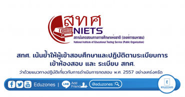 สทศ. เน้นย้ำให้ผู้เข้าสอบศึกษาและปฏิบัติตามระเบียบการเข้าห้องสอบ และ ระเบียบ สทศ. ว่าด้วยแนวทางปฏิบัติเกี่ยวกับการดำเนินการทดสอบ พ.ศ. 2557 อย่างเคร่งครัด EZ Webmaster March 10, 2020 สถาบันทดสอบทางการศึกษาแห่งชาติ (องค์การมหาชน) มีกำหนดการจัดการทดสอบวิชาสามัญ 9 วิชา ปีการศึกษา 2563 ในวันเสาร์ที่ 14 และวันอาทิตย์ที่ 15 มีนาคม 2563 ณ สนามสอบทั่วประเทศ สทศ. ขอเน้นย้ำให้ผู้เข้าสอบ ศึกษาและปฏิบัติตามระเบียบการเข้าห้องสอบและระเบียบ สทศ. ว่าด้วยแนวทางปฏิบัติเกี่ยวกับการดำเนินการทดสอบ พ.ศ. 2557 อย่างเคร่งครัด ระเบียบการเข้าห้องสอบ ไม่มีเลขที่นั่งสอบ ไม่มีสิทธิ์สอบ ไม่มีบัตรแสดงตน ไม่มีสิทธิ์สอบ ไปผิดสนามสอบ ไม่มีสิทธิ์สอบ ไปสายเกิน 30 นาที ไม่มีสิทธิ์สอบในวิชานั้น ห้ามนำเครื่องมืออุปกรณ์สื่อสารเข้าห้องสอบ ให้นั่งสอบจนหมดเวลา อนุญาตให้นำนาฬิกาเข้าห้องสอบ (ต้องเป็นนาฬิกาธรรมดาที่ใช้ดูเวลาเท่านั้น) ระเบียบ สทศ. ว่าด้วยแนวทางปฏิบัติเกี่ยวกับการดำเนินการทดสอบ พ.ศ. 2557 ที่เกี่ยวข้องกับผู้เข้าสอบ ระบุไว้ส่วนหนึ่งในข้อ… Continue Reading