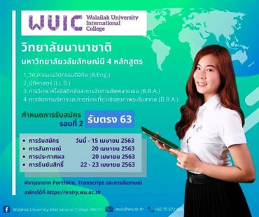 วิทยาลัยนานาชาติ ม.วลัยลักษณ์ รับตรงป.ตรี 4 หลักสูตรอินเตอร์ รวม 160 คน EZ Webmaster March 6, 2020 อาจารย์ ดร.จิตติมา ศังขมณี รักษาการแทนคณบดีวิทยาลัยนานาชาติ ม.วลัยลักษณ์ เปิดเผยว่า วิทยาลัยนานาชาติ มหาวิทยาลัยวลัยลักษณ์ กำลังเปิดรับนักเรียนชั้น ม.6 ที่มี GPA ไม่น้อยกว่า 2.5 และมีพื้นฐานภาษาอังกฤษดี และพร้อมจะพัฒนาจนใช้ภาษาอังกฤษได้คล่องแคล่ว เพื่อเข้าศึกษาต่อในระดับปริญญาตรี ประเภทรับตรง พร้อมโอกาสในการรับทุน ยกเว้นค่าธรรมเนียมการศึกษาจำนวนมาก เรียน 4 ปีมีโอกาสได้ 2 ปริญญา โดยมีรายละเอียดหลักสูตรนานาชาติที่เปิดรับนักศึกษา ประกอบด้วยหลักสูตรนิติศาสตร์ (นานาชาติ) การวิเคราะห์โลจิสติกส์และการจัดการซัพพลายเชน (นานาชาติ) วิศวกรรมนวัตกรรมดิจิทัล (นานาชาติ) การจัดการบริการและการท่องเที่ยวเชิงสุขภาพระดับสากล (นานาชาติ) รวม 160 คน อาจารย์ ดร.จิตติมา กล่าวต่อไปอีกว่า การเรียนการสอนในทุกหลักสูตรเป็นหลักสูตรอินเตอร์ นักศึกษาจะได้สัมผัสกับบรรยากาศอินเตอร์… Continue Reading