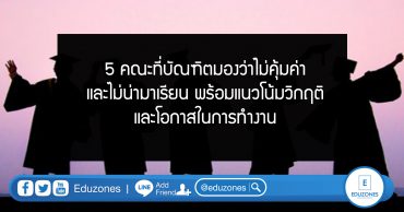 5 คณะที่บัณฑิตมองว่าไม่คุ้มค่าและไม่น่ามาเรียน พร้อมแนวโน้มวิกฤติและโอกาสในการทำงาน EZ Webmaster February 18, 2020 ในยุคปัจจุบันที่เทคโนโลยีเข้ามาเป็นส่วนหนึ่งของชีวิตมุนษย์ ทำให้การใช้ชีวิต การเรียน และการทำงานของเราง่ายขึ้น และยุคแห่งเทคโนโลยีนี้เองก็ทำให้อาชีพ และสาขาวิชาใหม่ๆ ทางด้าน IT นั้นกลายเป็นสาขาวิชาที่น่าเรียน เพราะมีโอกาสก้าวหน้าและเติบโตในอนาคต แต่ยุคแห่งเทคโนโลยีนี้เองก็ทำให้หลายคณะและสาขาวิชากลายเป็นคณะที่อาจจะหายไปในอนาคตได้เช่นกัน โดยจากการสำรวจข้อมูลของ CNBC (Consumer News and Business Channel) เครือข่ายโทรทัศน์เคเบิลที่เสนอข่าวสารเกี่ยวกับตลาดหุ้นทั่วโลก ของประเทศสหรัฐอเมริกา พบว่ามี 5 คณะที่บัณฑิตจบมาแล้วมองว่าไม่คุ้มค่าและไม่น่ามาเรียน ซึ่งเป็นแนวโน้มให้ 5 คณะ/สาขาวิชาดังกล่าวอาจหายไปในอนาคต อันได้แก่ ภาษาอังกฤษ เริ่มจากสาขาวิชาภาษาอังกฤษ ข้อมูลนี้ CNBC (Consumer News and Business Channel) ทำการสำรวจในประเทศที่พูดอังกฤษเป็นภาษาหลัก หากเทียบกับบ้านเราก็คงต้องเป็น… Continue Reading