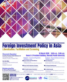 DPU ชวนนักธุรกิจ นักลงทุน ร่วมงานสัมมนาวิชาการระดับนานาชาติ Recent Development in Regulations and Investment Policy in Asia EZ Webmaster February 3, 2020 คณะนิติศาสตร์ปรีดี พนมยงค์ มหาวิทยาลัยธุรกิจบัณฑิตย์ ร่วมกับ British Institute of International and Comparative Law และ Nagoya University ขอเชิญชวนนักธุรกิจและนักลงทุนร่วมงานสัมมนาวิชาการระดับนานาชาติ หัวข้อ Recent Development in Regulations and Investment Policy in Asia: Investment Liberalization, Investment Facilitation & FDI Screening โดยได้รับเกียรติจาก ศาสตราจารย์พิเศษ วิศิษฏ์ วิศิษฏ์สรอรรถ ปลัดกระทรวงยุติธรรม และ Ms. Mia Mikic ผู้อำนวยการกองการค้า การลงทุน และนวัตกรรมของ UNESCAP ร่วมสัมมนา เพื่อให้นักกฎหมาย นักลงทุน ได้ร่วมเสวนาแลกเปลี่ยนความรู้ ความท้าทายของนโยบายการลงทุน ความเข้าใจในสถานการณ์ปัจจุบันของการลงทุนระหว่างประเทศ รวมถึงเรื่องการระงับข้อพิพาทระหว่างประเทศ นอกจากนี้ยังมีนักวิชาการชั้นนำอีกมากมายร่วมงาน จัดขึ้นในวันอังคารที่ 10 มีนาคม… Continue Reading
