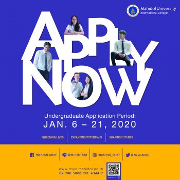 มหิดลอินเตอร์ เปิดรับนักศึกษาใหม่ระดับปริญญาตรี วันที่ 6-21 มกราคม 2563 tui sakrapee December 24, 2019 วิทยาลัยนานาชาติ มหาวิทยาลัยมหิดล (MUIC) เปิดรับสมัครนักศึกษาใหม่ระดับปริญญาตรี หลักสูตรนานาชาติ โดยไม่ผ่านระบบ TCAS รอบที่ 4 ประจำปีการศึกษา 2562-2563 จำนวน 6 หลักสูตร 16 สาขาวิชา ระหว่างวันที่ 6 -21 มกราคม 2563 โดยมีรายละเอียดดังนี้ หลักสูตรนิเทศศาสตร์บัณฑิต (BACHELOR OF COMMUNICATION ARTS : B.COM.ARTS) – สาขาวิชาสื่อและการสื่อสาร (Media and Communication) หลักสูตรศิลปกรรมศาสตร์บัณฑิต (BACHELOR OF FINE ARTS : B.F.A.) – สาขาวิชาออกแบบนิเทศศิลป์ (Communication Design) หลักสูตรศิลปศาสตรบัณฑิต (BACHELOR OF ARTS : B.A.) –… Continue Reading