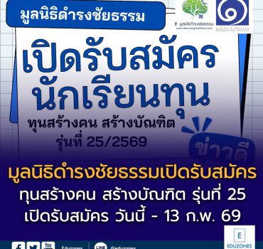 Blogทุนดีดีนักเรียน เปิดรับสมัครทุน “สร้างคน สร้างบัณฑิต” รุ่นที่ 25/2569 📣 เปิดรับสมัครทุน “สร้างคน สร้างบัณฑิต” รุ่นที่ 25/2569 โอกาสทางการศึกษาสำหรับเยาวชนไทย ที่ไม่ได้มุ่งแค่ให้ “โตได้” แต่ต้อง “โตดี” มูลนิธิดำรงชัยธรรม ประกาศเปิดรับสมัครคัดเลือกผู้สมัครเข้ารับ…