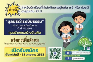 มูลนิธิดำรงชัยธรรม เปิดรับสมัครทุนการศึกษาระดับปริญญาตรี ทุนสร้างคน สร้างบัณฑิต “นวัตกรเพื่อสังคม” EZ Webmaster December 16, 2019 มูลนิธิดำรงชัยธรรม เปิดรับสมัครทุนการศึกษาระดับปริญญาตรี (ทุนต่อเนื่อง แบบครบวงจร) จำนวน 20 ทุน ในโครงการทุนสร้างคน สร้างบัณฑิต “นวัตกรเพื่อสังคม” รุ่นที่ 19/2563 เปิดรับสมัครตั้งแต่วันนี้ – 31 มกราคม 2563 สามารถเข้าดูรายละเอียดเพิ่มเติมได้ที่เว็บไซต์ตามลิงก์ http://www..com/application Continue Reading