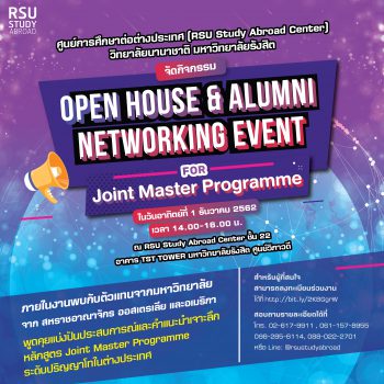 ม.รังสิต จัดกิจกรรมส่งท้ายปี Open House and Alumni Networking Event for Joint Master Programs EZ Webmaster November 28, 2019 ศูนย์การศึกษาต่อต่างประเทศ (RSU Study Abroad Center) วิทยาลัยนานาชาติ มหาวิทยาลัยรังสิต จัดกิจกรรม “Open House and Alumni Networking Event for Joint Master Programs” ในวันอาทิตย์ที่ 1 ธันวาคม 2562 เวลา 14.00-16.00 น. ณ RSU Study Abroad Center ชั้น 22 อาคาร TST TOWER มหาวิทยาลัยรังสิตศูนย์วิภาวดี ภายในงานพบกับตัวแทนจากมหาวิทยาลัยจากสหราชอาณาจักร ออสเตรเลีย และอเมริกา พูดคุยแบ่งปันประสบการณ์และคำแนะนำเจาะลึกหลักสูตร Joint Master Program ระดับปริญญาโทในต่างประเทศ สำหรับผู้ที่สนใจสามารถลงทะเบียนร่วมงานได้ที่ http://bit.ly/2K8GgrW หรือสอบถามรายละเอียดได้ที่ โทร 02-617-9911 , 061-157-8955 , 098-285-6114, 088-022-2701 หรือ Line: @rsustudyabroad หรือคลิก https://line.me/R/ti/p/%40rsustudyabroad Continue Reading