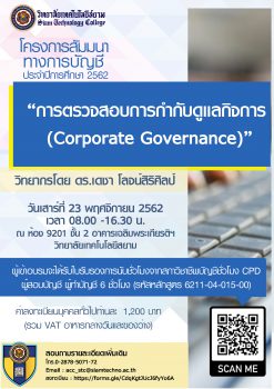 คณะบัญชี วิทยาลัยเทคโนโลยีสยาม จัดอบรมเรื่อง การตรวจสอบการกำกับดูแลกิจการ EZ Webmaster November 15, 2019 คณะบัญชี วิทยาลัยเทคโนโลยีสยาม (STC) จัดโครงการสัมมนาทางการบัญชี ประจำปีการศึกษา 2562 เรื่อง “การตรวจสอบการกำกับดูแลกิจการ (Corporate Governance)” วิทยากรโดย ดร.เดชา โลจน์สิริศิลป์ ในวันเสาร์ที่ 23 พฤศจิกายน พ.ศ.2562 ตั้งแต่เวลา 08.00 -16.30 น. ณ ห้อง 9201 ชั้น 2 อาคารเฉลิมพระเกียรติฯ วิทยาลัยเทคโนโลยีสยาม ผู้เข้าอบรมจะได้รับใบรับรองการนับชั่วโมงจากสภาวิชาชีพบัญชีชั่วโมง CPD ผู้สอบบัญชี ผู้ทำบัญชี 6 ชั่วโมง (รหัสหลักสูตร 6211-04-015-00) ค่าลงทะเบียนบุคคลทั่วไปท่านละ 1,200 บาท (รวม VAT อาหารกลางวันและของว่าง)… Continue Reading