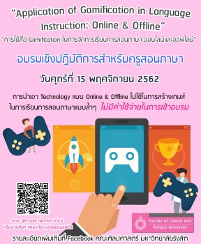 ศิลปศาสตร์ ม.รังสิต จัดอบรมเชิงปฏิบัติสำหรับครูสอนภาษา หัวข้อ การใช้สื่อ Gamification ในการจัดการเรียนการสอนภาษา ออนไลน์และออฟไลน์ EZ Webmaster November 14, 2019 คณะศิลปศาสตร์ มหาวิทยาลัยรังสิต จัดอบรมเชิงปฏิบัติสำหรับครูสอนภาษา หัวข้อ “Application of Gamification in Language Instruction: Online & Offline” (การใช้สื่อ Gamification ในการจัดการเรียนการสอนภาษา ออนไลน์และออฟไลน์) ในวันศุกร์ที่ 15 พฤศจิกายน 2562 เวลา 09.00-16.00 น. ณ ห้อง 6B-506 อาคาร Student Center มหาวิทยาลัยรังสิต โดยมีวัตถุประสงค์เพื่อให้ผู้สอนภาษาสามารถนำเอา Technology ไปประยุกต์ใช้ในการสร้างเกมเพื่อการเรียนการสอนภาษา ผู้ที่สนใจสามารถสอบถามรายละเอียดเพิ่มเติมได้ที่ 0-2791-6000 ต่อ 1239 Continue Reading