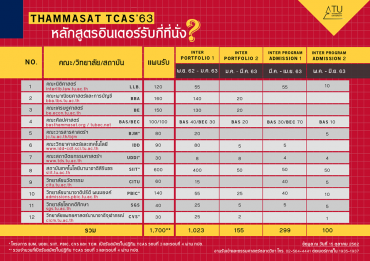 จำนวนรับ หลักสูตรอินเตอร์ ม.ธรรมศาสตร์ 2563 EZ Webmaster October 23, 2019 ▶️สมัครกับทางเว็บไซต์ของคณะ • คณะนิติศาสตร์ www.interllb.law.tu.ac.th • คณะพาณิชยศาสตร์และการบัญชี www.bba.tbs.tu.ac.th • คณะเศรษฐศาสตร์ www.be.econ.tu.ac.th • คณะศิลปศาสตร์ www.basthammasat.org / www.tubec.net • คณะวารสารศาสตร์ฯ www.jc.tu.ac.th/bjm • คณะวิทยาศาสตร์ฯ www.idd-cdt.sci.tu.ac.th • คณะสถาปัตยกรรมศาสตร์ฯ www.tds.tu.ac.th • สถาบันเทคโนโลยีนานาชาติสิรินธร www.siit.tu.ac.th • วิทยาลัยนวัตกรรม www.citu.tu.ac.th • วิทยาลัยนานาชาติปรีดี พนมยงค์ www.admissions.pbic.tu.ac.th • วิทยาลัยโลกคดีศึกษา www.sgs.tu.ac.th • วิทยาลัยแพทยศาสตร์นานาชาติจุฬาภรณ์ www.cicm.tu.ac.th Continue Reading