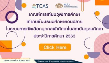 ทปอ. ประกาศ เกณฑ์การเทียบวุฒิการศึกษาเท่ากับชั้นมัธยมศึกษาตอนปลาย ใน TCAS63 EZ Webmaster September 26, 2019 ทปอ. ประกาศ เกณฑ์การเทียบวุฒิการศึกษาเท่ากับชั้นมัธยมศึกษาตอนปลาย ใน #TCAS63 สำหรับผู้ที่ใช้วุฒิการศึกษาเทียบเท่าจากต่างประเทศ เช่น GED หรือ ผู้สำเร็จการศึกษาจากต่างประเทศ เป็นต้น ที่จะเข้าคัดเลือกใน #TCAS63 โหลดที่ >> คลิก Continue Reading